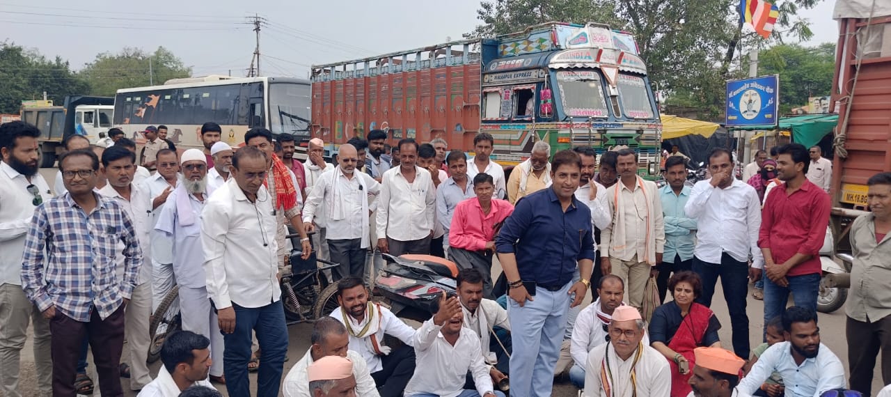 त्याबाबद सविस्तर असे की,गेल्या काही दिवसापासून सुरु असलेल्या अतिवृष्टीमुळे शेतकरी हवालदिल झाला आहे.त्याला शासनाने कुठल्याच प्रकारची मदत न करता फक्त तोंडाला पानं पुसण्याचे काम केले आहे. एकीकडे शेतकरी आसमानी संकटाचा सामना करत असतांना महायुती जाहिरनाम्यात जे कर्जमाफी करुन शेतकऱ्याचा सातबारा कोरा करु हे आश्वासन देऊन सत्तेतवर आली त्याच आश्वासनावरुन सरकार वेळ काढुपणा करत आहे. त्या आश्वसानाची पूर्तता करुन शेतऱ्यांचा सातबारा सरसकट कोरा करा या मागणीसाठी आज शेतकरी रस्त्यावर उतरून त्यांनी चक्का जाम आंदोलन केले. दिलेल्या निवेदनातील मागण्या पुढील प्रमाणे कुठल्याही अटी शर्ती न ठेवता सरसकट सातबारा कोरा करा,सोयाबीन कापूस मका यांची शासकीय खरेदी केंद्र सुरु करा,शेतमालाला उत्पादन खर्चावर आधारीत योग्य भाव द्या,दुधाचे दर वाढवा,पेरणी ते कापनीचा खर्च रोजगार हमीतुन करा अशा विविध मागण्या दिलेल्या निवेदनातुन करण्यात आल्या.