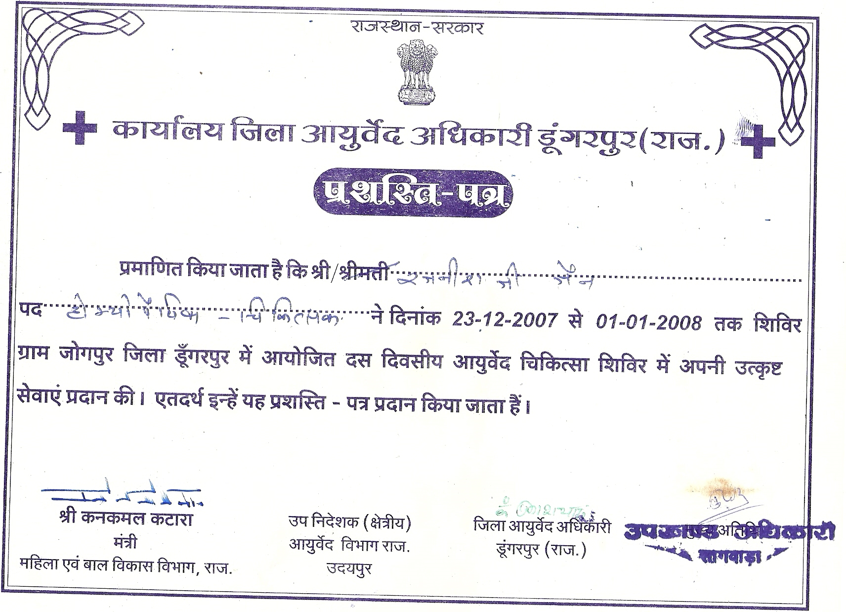 🎖️ प्रशस्ति पत्र पर जिला आयुर्वेद अधिकारी श्री कन्हैयालाल कवर एवं संयुक्त निदेशक आयुर्वेद डॉ. एम. एल. चौधरी के हस्ताक्षर हैं, जो इस सेवा को प्रशासनिक मान्यता प्रदान करते हैं।