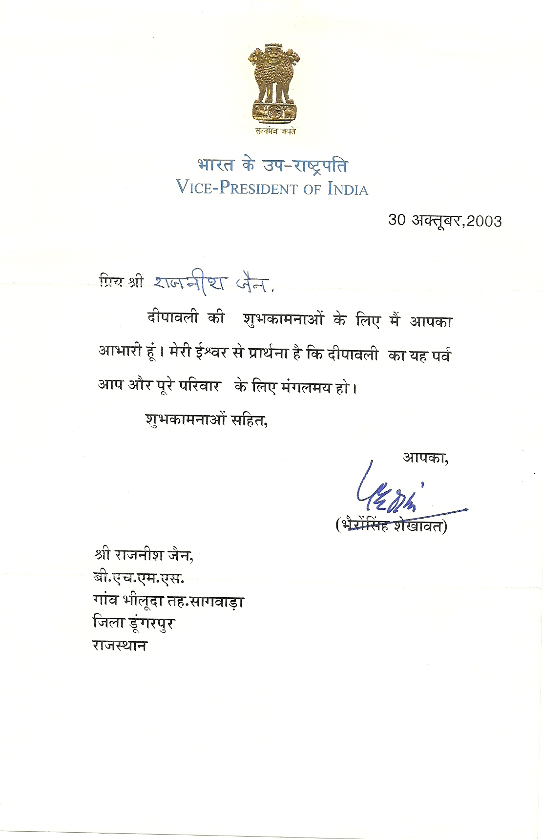 भारत के पूर्व उप-राष्ट्रपति स्वर्गीय भैरोंसिंह शेखावत ने वर्ष 2003 में दीपावली के पावन अवसर पर डॉ. रजनीश जैन को व्यक्तिगत रूप से शुभकामना पत्र भेजा था। इस पत्र में उन्होंने ईश्वर से प्रार्थना की थी कि यह पर्व डॉ. जैन और उनके परिवार के लिए मंगलमय हो।