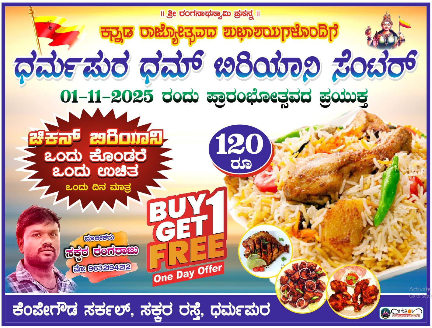 ಗೆಳೆಯರೇ ಹಿರಿಯೂರು ತಾಲ್ಲೂಕು ಧರ್ಮಪುರ ಗ್ರಾಮದ ಸಕ್ಕರ ರೋಡ್ ಇಲ್ಲಿ ನೂತನವಾಗಿ ಆರಂಭವಾಗಿರುವ " ಧರ್ಮಪುರ ಧಮ್ ಬಿರಿಯಾನಿ " ಸೆಂಟರ್ ನಲ್ಲಿ ದಿನಾಂಕ 01/11/2025 ಅಂದರೆ ನಾಳೆ ಕನ್ನಡ ರಾಜ್ಯೋತ್ಸವದ ಪ್ರಯುಕ್ತ ಒಂದು ಬಿರಿಯಾನಿ ಕೊಂಡರೆ ಮತ್ತೊಂದು ಬಿರಿಯಾನಿ ಉಚಿತವಾಗಿ ಕೊಡುತ್ತಾರೆ ಧರ್ಮಪುರ ಗ್ರಾಮದ ನಿವಾಸಿಗಳು ಮತ್ತು ಸುತ್ತ ಹಳ್ಳಿಯ ಬಿರಿಯಾನಿ ಪ್ರಿಯರಿಗೆ ಇದು ತುಂಬಾ ಒಳ್ಳೆಯ ವಿಷಯ ರುಚಿಕರವಾದ ಬಿರಿಯಾನಿ ಸವಿಯಲು ಎಲ್ಲರೂ ನಾಳೆ ಭೇಟಿ ಕೊಡಿ.