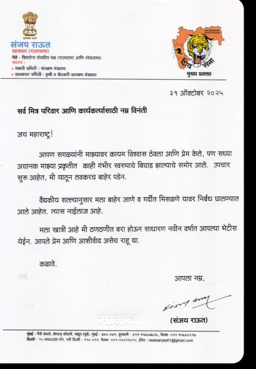 31 अक्टूबर 2025 को, संजय राउत ने सोशल मीडिया पर एक पत्र पोस्ट करके जानकारी दी कि वह गंभीर स्वास्थ्य समस्याओं से पीड़ित हैं और उनका इलाज चल रहा है।