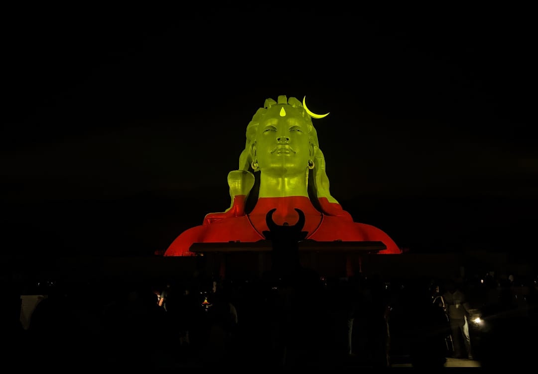 ಕರ್ನಾಟಕ ರಾಜ್ಯೋತ್ಸವದ ಅಂಗವಾಗಿ ರಾಜ್ಯ ಧ್ವಜದ ಅರಿಶಿನ ಕುಂಕುಮ ಬಣ್ಣಗಳೊಂದಿಗೆ ಕಂಗೊಳಿಸಿದ ಸದ್ಗುರು ಸನ್ನಿಧಿ, ಬೆಂಗಳೂರಿನ ಅದಿಯೋಗಿ