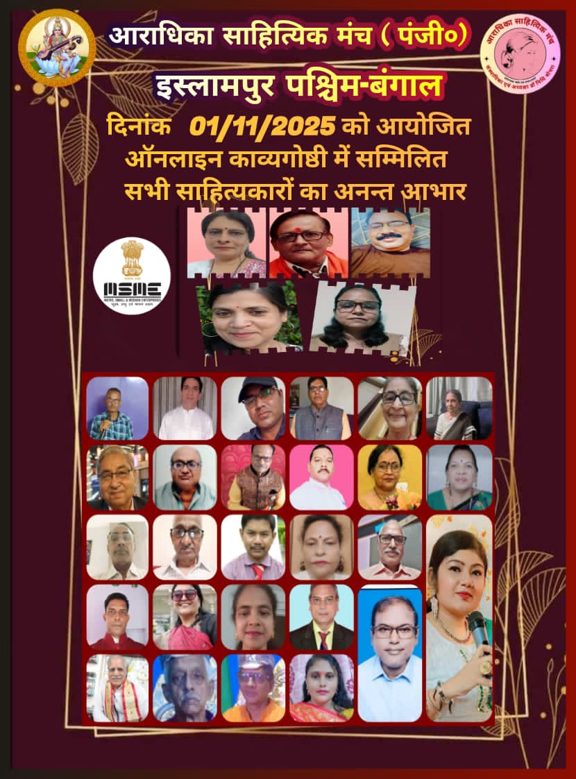 गोंडा -आराधिका साहित्यिक मंच (पंजी.) के तत्वावधान में 01 नवंबर' 2025 को 51 वीं भव्य आभासी काव्य गोष्ठी का आयोजन किया गया। जो 4:00 बजे से रात्रि लगभग 07: 30 बजे तक निरंतर गतिमान रहकर भव्यता के साथ संपन्न हुई।