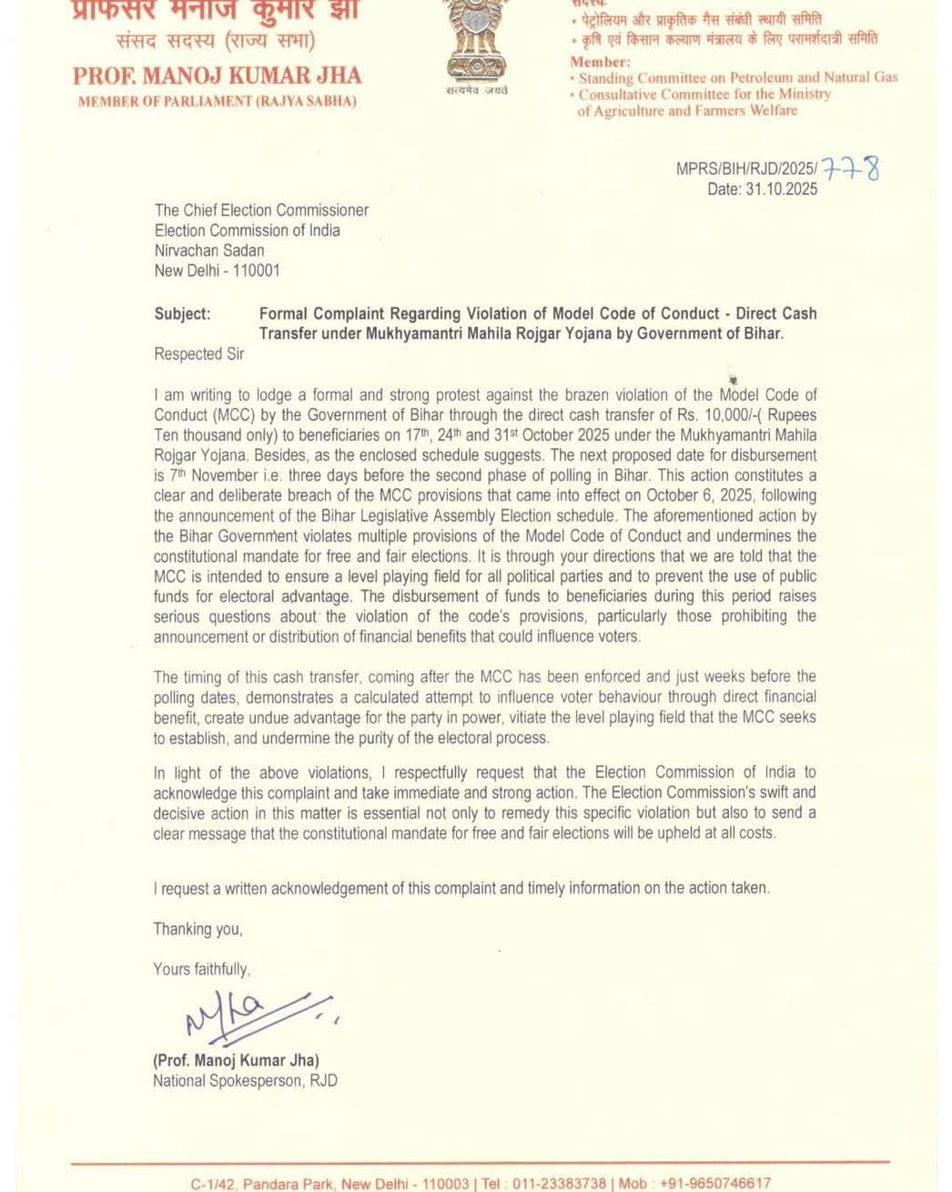 इसपर Manoj Kumar Jha जी का ये पत्र पढ़िए जो उनके द्वारा मुख्य निर्वाचन आयुक्त को लिखा गया है।
