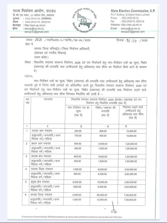 UP पंचायत चुनाव 2026 : नामांकन शुल्क और खर्च की सीमा तयग्राम पंचायत सदस्य से लेकर ग्राम प्रधान तक पदों के लिए खर्च व शुल्क निर्धारित नामांकन पत्र ...