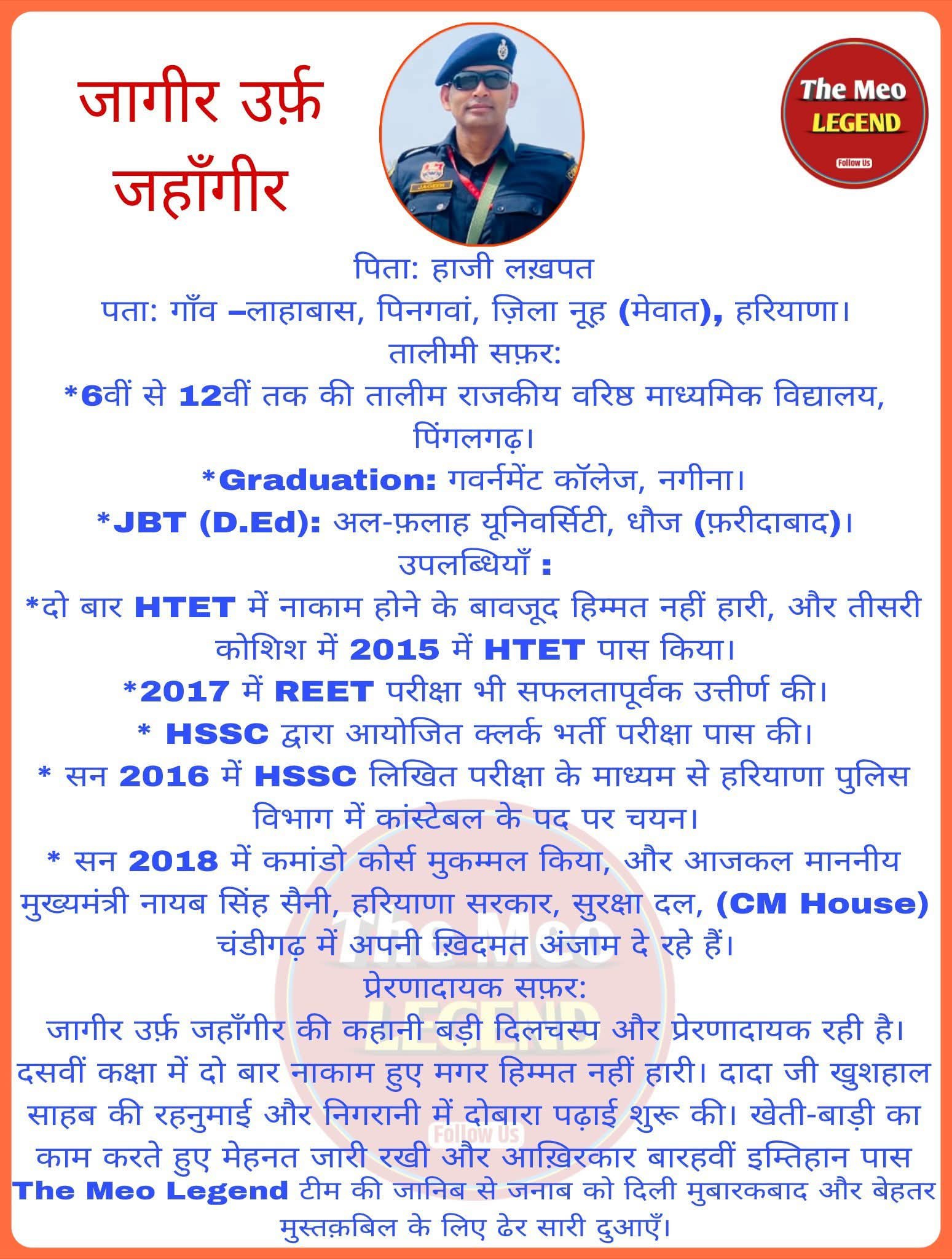 рдЬрд╛рдЧреАрд░ рдЙрд░реНрдлрд╝ рдЬрд╣рд╛рдБрдЧреАрд░ рдХреА рдХрд╣рд╛рдиреА рдмрдбрд╝реА рджрд┐рд▓рдЪрд╕реНрдк рдФрд░ рдкреНрд░реЗрд░рдгрд╛рджрд╛рдпрдХ рд░рд╣реА рд╣реИред рджрд╕рд╡реАрдВ рдХрдХреНрд╖рд╛ рдореЗрдВ рджреЛ рдмрд╛рд░ рдирд╛рдХрд╛рдо рд╣реБрдП рдордЧрд░ рд╣рд┐рдореНрдордд рдирд╣реАрдВ рд╣рд╛рд░реАред рджрд╛рджрд╛ рдЬреА рдЦреБрд╢рд╣рд╛рд▓ рд╕рд╛рд╣рдм рдХреА рд░рд╣рдиреБрдорд╛рдИ рдФрд░ рдирд┐рдЧрд░рд╛рдиреА рдореЗрдВ рджреЛрдмрд╛рд░рд╛ рдкрдврд╝рд╛рдИ рд╢реБрд░реВ рдХреАред рдЦреЗрддреА-рдмрд╛рдбрд╝реА рдХрд╛ рдХрд╛рдо рдХрд░рддреЗ рд╣реБрдП рдореЗрд╣рдирдд рдЬрд╛рд░реА рд░рдЦреА рдФрд░ рдЖрдЦрд╝рд┐рд░рдХрд╛рд░ рдмрд╛рд░рд╣рд╡реАрдВ рдЗрдореНрддрд┐рд╣рд╛рди рдкрд╛рд╕ The Meo Legend рдЯреАрдо рдХреА рдЬрд╛рдирд┐рдм рд╕реЗ рдЬрдирд╛рдм рдХреЛ рджрд┐рд▓реА рдореБрдмрд╛рд░рдХрдмрд╛рдж рдФрд░ рдмреЗрд╣рддрд░ рдореБрд╕реНрддрдХрд╝рдмрд┐рд▓ рдХреЗ рд▓рд┐рдП рдвреЗрд░ рд╕рд╛рд░реА рджреБрдЖрдПрдБред