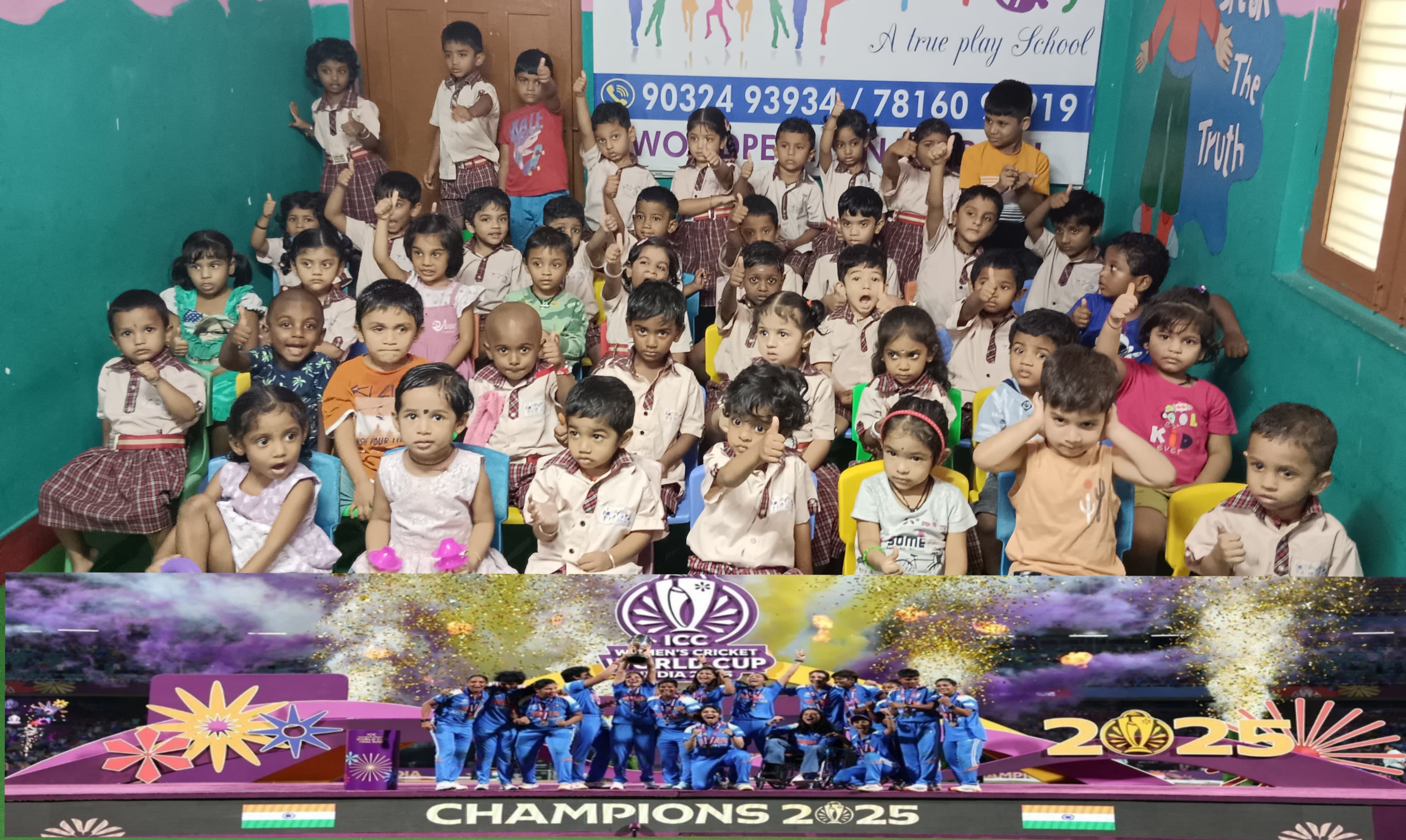 ఆకర్ష టీవీ అనకాపల్లి: స్థానిక వుడ్ పేట హ్యాపీ కిడ్స్ ప్లే స్కూల్లో ఐసీసీ మహిళల వన్డే ప్రపంచ కప్ లో భారత్ జట్టు దక్షిణాఫ్రికా జట్టుతో తలపడి, తొలిసారి భారత మహిళా క్రికెటర్లు విశ్వ విజేతగా నిలిచిన సందర్భంగా చిట్టి పొట్టి చిన్నారులు , కరస్పాండెంట్ శేశెట్టి గిరీష్ కుమార్ అభినందనలు తెలియజేశారు. క్రికెట్ కేవలం పురుషులదే కాదని, ఆట అందరిదీ అని, మహిళలు కూడా క్రికెట్లో చరిత్ర సృష్టించారని ప్రిన్సిపాల్ సునీత తెలియజేశారు. కార్యక్రమంలో సిబ్బంది, విశ్రాంత నీటిపారుదల శాఖ ఏఈ మల్ల చిన్నారావు తదితరులు పాల్గొన్నారు.