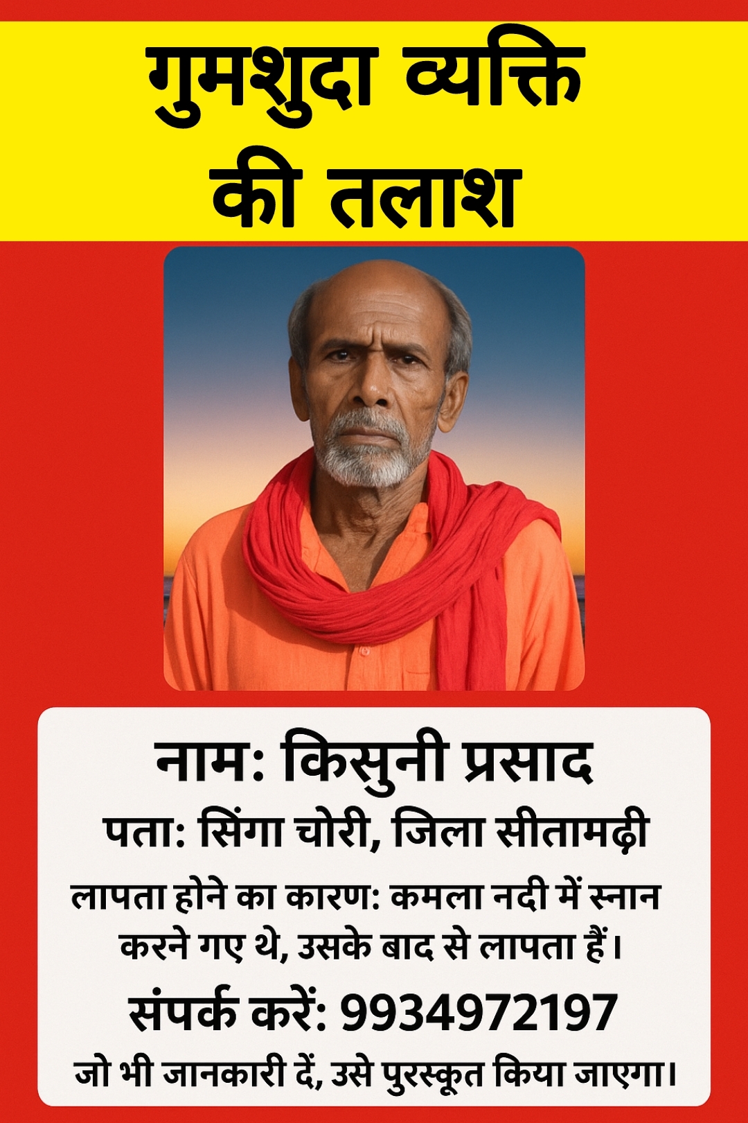 आज कार्तिक पूर्णिमा के अवसर पर किसुनी प्रसाद जी (पता – सिंगा चौरि, जिला सीतामढ़ी) कमला नदी में स्नान करने आए थे, जहाँ से वे अपने परिजनों से बिछड़ गए हैं और अब तक मिल नहीं पाए हैं।