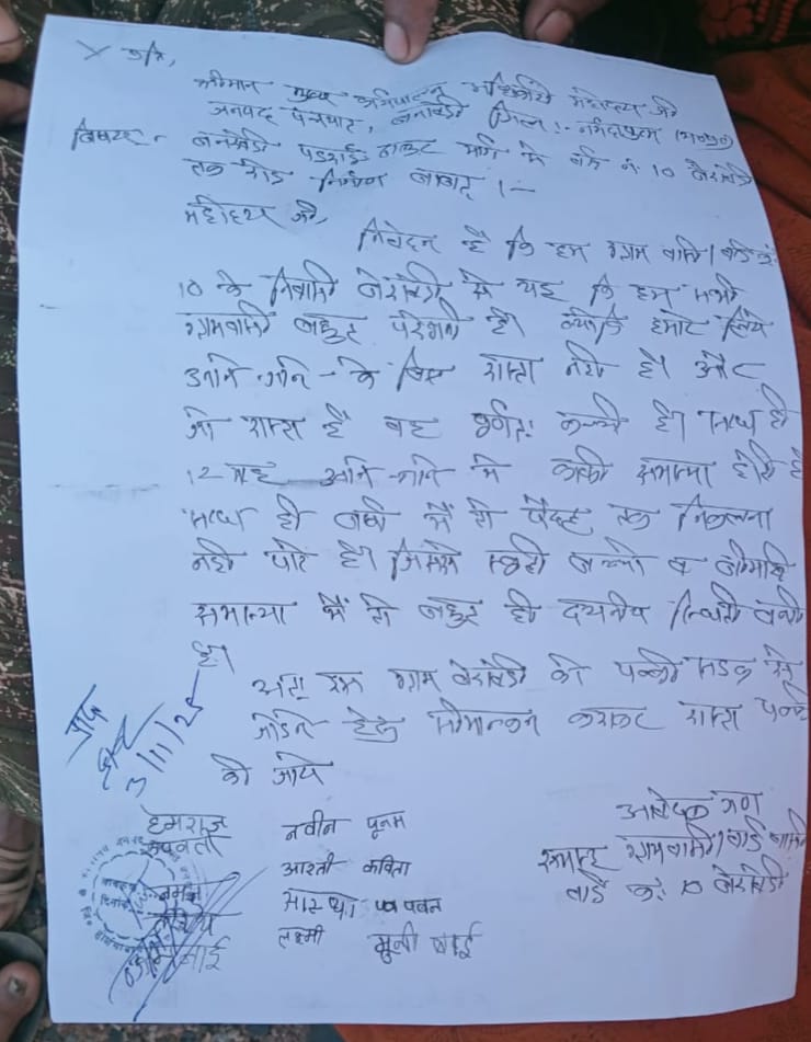 नर्मदा पुरम जिले के तहसील बनखेड़ी के अंतर्गत आने वाले ग्राम आज भी आजादी के 78 वर्ष बाद भी विकास के लिए तरस रहे है ग्राम बेरखेड़ी ग्राम पंचायत पांजरा के ग्रामवासी (ग्रामीण) महिलाओं के द्वारा जनपद पंचायत बनखेडी जिला नर्मदापुरम CEO महोदया को ग्राम बेरखेड़ी से पड़राई ठाकुर/ बिछुआ रोड तक रोड पूर्ण रूप से कच्ची है बहुत परेशानी होती है तो उसे पक्की रोड बनाने के लिया महोदया को ग्रामीण महिलाओं के द्वारा आवेदन दिया गयाक्योंकि ग्रामीण क्षेत्र के छात्र छात्राओं को स्कूल आने जाने मे परेशानियों का सामना करना पडता है जिसमे मुख्य रूप से सभी ग्रामीण महिलाएं उपस्थित थी।