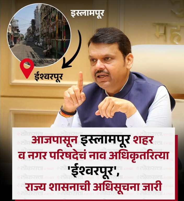 मुख्यमंत्री श्री. देवेंद्रजी फडणवीस यांचे कडून जाहीर..आजपासून इस्लामपूर शहर व नगर परिषदेचे नाव अधिकृत्या 'ईश्वरपूर 'राज्य शासनाची अधिसूचना जारी