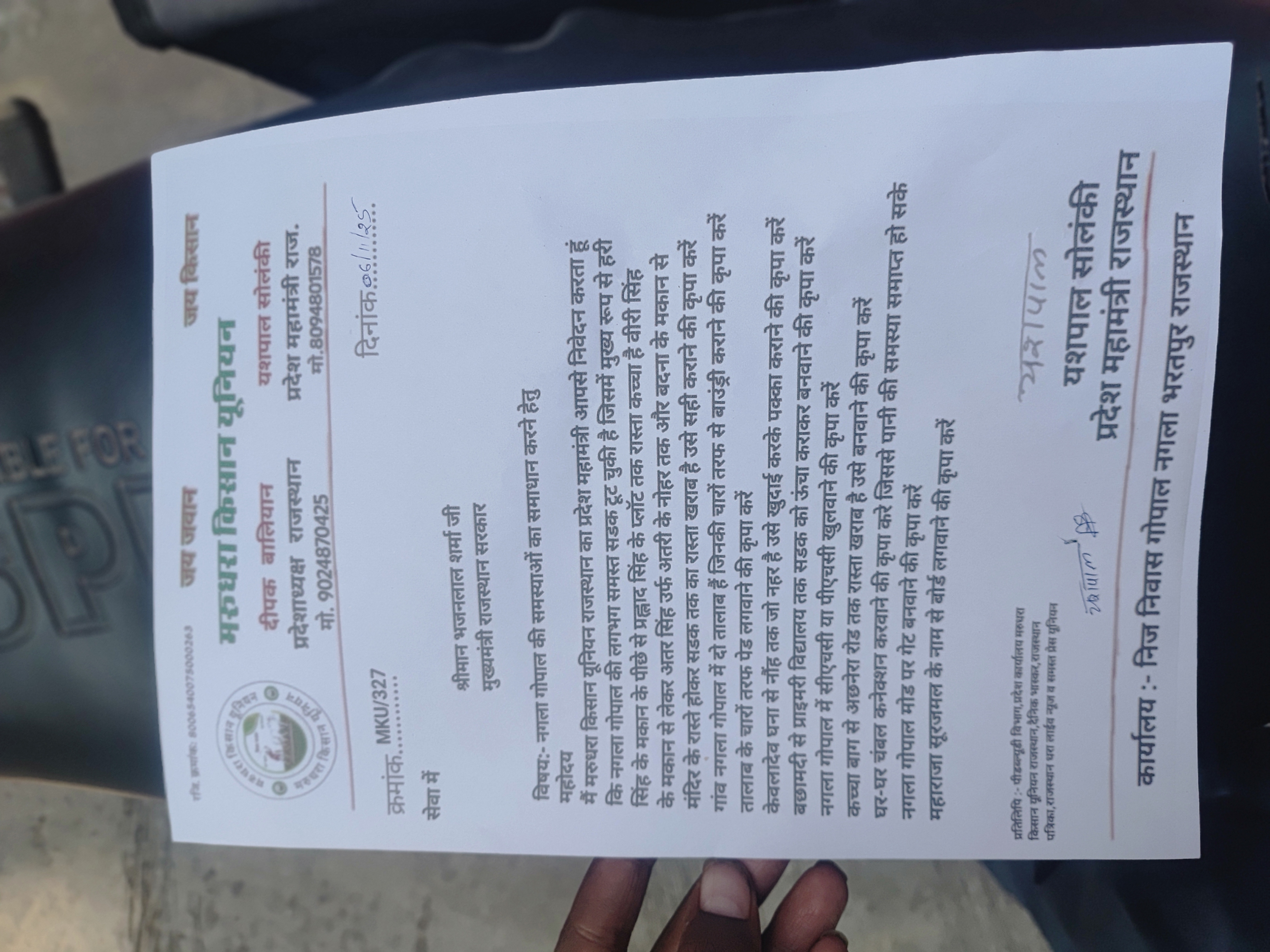 मरुधरा किसान यूनियन राजस्थान के प्रदेश महामंत्री यशपाल सोलंकी के नेतृत्व में जन सुनवाई केन्द्र में नगला गोपाल की निम्न समस्याओं को लेकर आकाश शर्मा के साथ मिलकर ज्ञापन दिया जिसमें यशपाल सोलंकी ने बताया कि नगला गोपाल की लगभग समस्त सडक टूट चुकी है जिसमें मुख्य रूप से हरी सिंह के मकान के पीछे से प्रह्लाद सिंह के प्लॉट तक रास्ता कच्चा है वीरी सिंह के मकान से लेकर अतर सिंह उर्फ अतरी के नोहर तक और बदना के मकान से मंदिर के रास्ते होकर सडक तक का रास्ता खराब है उसे सही कराने की कृपा करें गांव नगला गोपाल में दो तालाब हैं जिनकी चारों तरफ से बाउंड्री कराने की कृपा करें तालाब के चारों तरफ पेड लगवाने की कृपा करें केवलादेव घना से नौंह तक जो नहर है उसे खुदाई करके पक्का कराने की कृपा करें बछामदी से प्राइमरी विद्यालय तक सडक को ऊंचा कराकर बनवाने की कृपा करें नगला गोपाल में सीएचसी या पीएचसी खुलवाने की कृपा करें कच्चा बाग से अछनेरा रोड तक रास्ता खराब है उसे बनवाने की कृपा करें घर-घर चंबल कनेक्शन करवाने की कृपा करे जिससे पानी की समस्या समाप्त हो सके नगला गोपाल मोड पर गेट बनवाने की कृपा करें महाराजा सूरजमल के नाम से बोर्ड लगवाने की कृपा करें