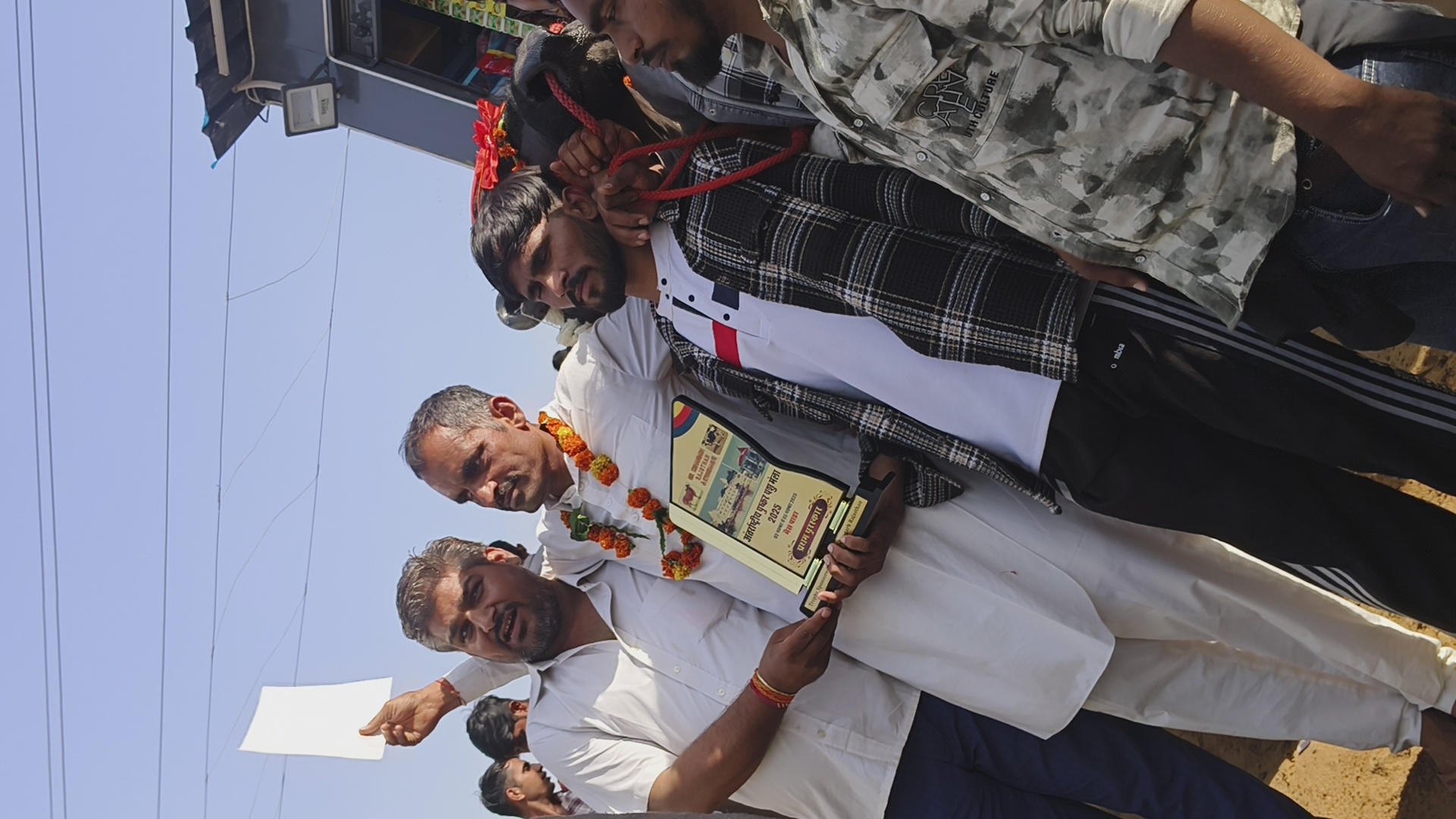 कोटा से आए समाज सेवी अरविंद जी धारणिया विश्नोई ने पुष्कर मेला में चैम्पियन रहे कुबेर भैंसा को ओर मालिक विकास जी को सम्मानित किया