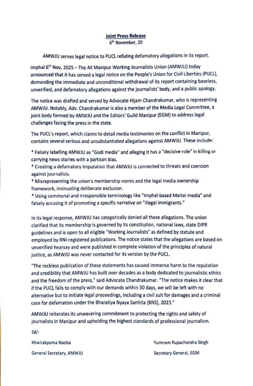 Imphal, November 6, 2025: The All Manipur Working Journalists Union (AMWJU) has fired a legal salvo at the People’s Union for Civil Liberties (PUCL), serving a formal notice demanding the immediate withdrawal of what it terms a “baseless, unverified, and defamatory” report targeting journalists in Manipur, along with a public apology.
