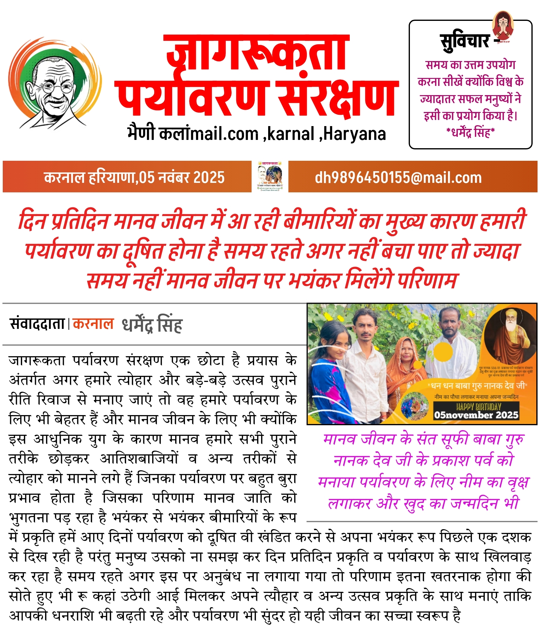 जागरूकता पर्यावरण संरक्षण एक छोटा सा प्रयास के अंतर्गत अगर हमें अपना जीवन स्वस्थ जीना है तो हमें समय रहते पर्यावरण को स्वस्थ रखना होगा अन्यथा इतनी बीमारियां शरीर में आएगी की घर-घर मैरिज ही मिलेंगे अक्सर देखने में आया है कि आज के मानव को जीने के लिए अपने जेब में किसी ने किसी तरह की दवाई रखनी पड़ती है और आने वाले समय में इसका क्या परिणाम होगा वह आप खुद समझ सकते हो इसलिए हमारा प्रयास तो हर त्यौहार प्रकृति के साथ मनाने का है क्योंकि दिन प्रतिदिन पर्यावरण को इतना दूषित किया जा रहा है जिसका परिणाम बहुत खतरनाक होने वाला है आओ मिलकर पर्यावरण को स्वस्थ करें ताकि जीवन स्वस्थ हो सके