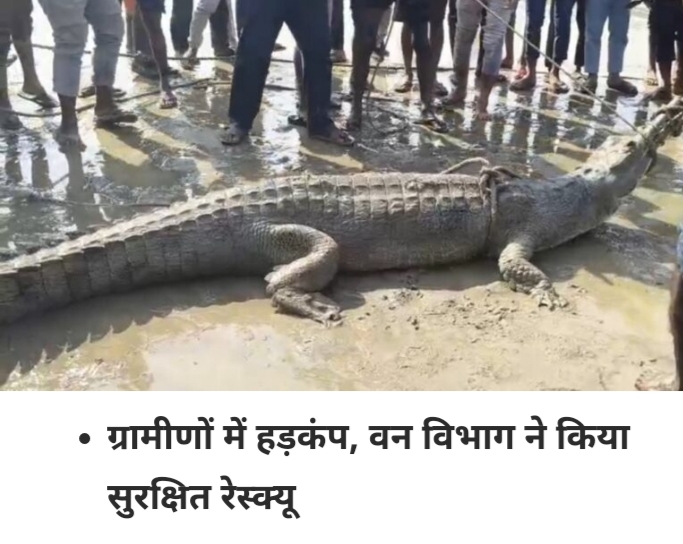 वन विभाग के अधिकारियों ने मगरमच्छ को पकड़ने के बाद उसे चहलारी घाट के पास सुरक्षित छोड़ दिया ।