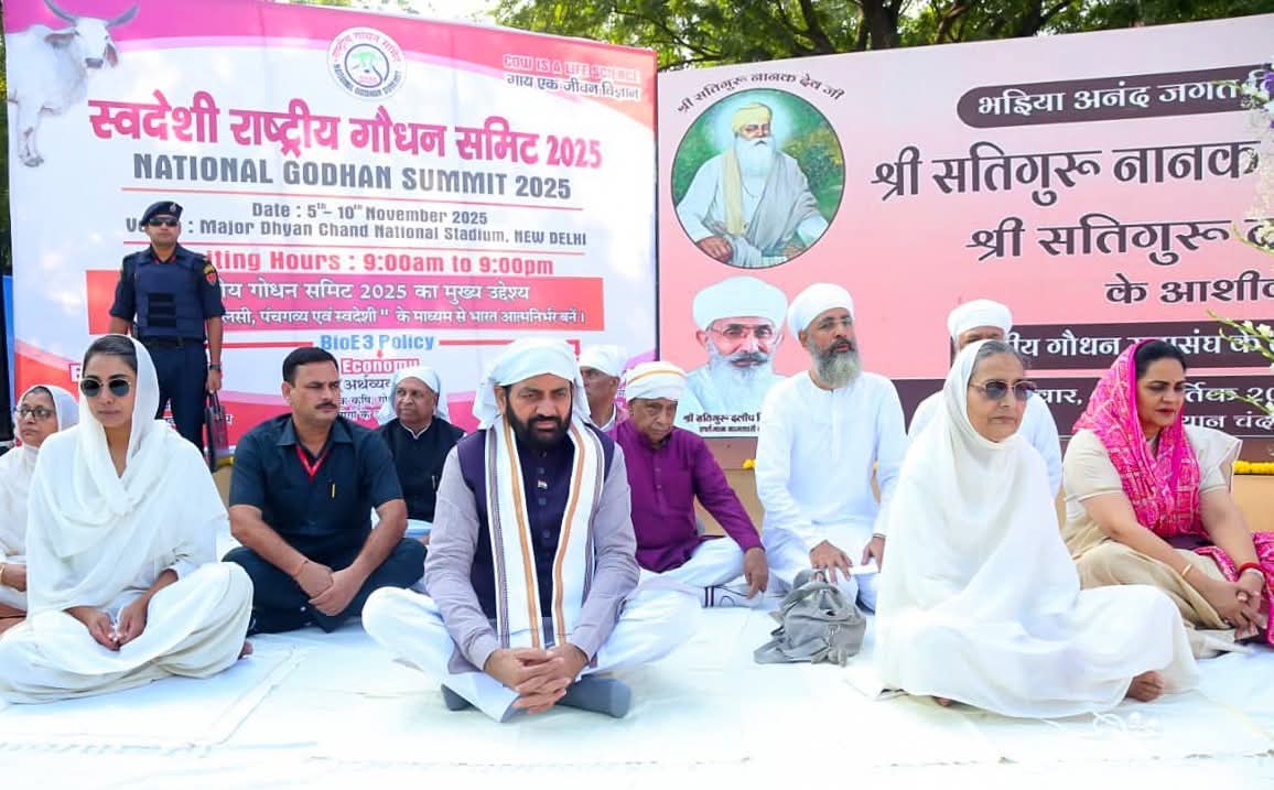 05-11-2025 (नई दिल्ली) राष्ट्रीय गौधन महासंघ द्वारा 5 नवंबर से 10 नवंबर तक ‘आत्मनिर्भर भारत’ बनाने के लिए ‘मेजर ध्यान चंद नेशनल स्टेडियम’ नई दिल्ली में ‘एक विचारात्मक अहिंसक आंदोलन’ चलाया जा रहा है। जिस का शुभारंभ वर्तमान नामधारी गुरू, सतिगुरू दलीप सिंघ जी महाराज के आशीर्वाद एवं मार्गदर्शन में, सतिगुरू नानक देव जी का प्रकाश पर्व मनाया गया। इस कार्यक्रम की मुख्य अध्यक्षता श्री सतिगुरू दलीप सिंघ जी की सपुत्री बीबी सुश्री जीवन कौर जी ने की। इस अवसर पर हरियाणा के मुख्य मंत्री नायब सिंघ सैनी, विश्व हिन्दू परिषद के अंतर्राष्ट्रीय अध्यक्ष श्री आलोक कुमार, नई दिल्ली के लोक सभा के सांसद सुश्री बांसुरी स्वराज जी, सिरसा से पूर्व सांसद सुश्री सुनीता दुग्गल जी, स्वामी सुधांशु जी महाराज, श्री सतीश तनेजा और इस शिखर सम्मेलन की संयोजक एवं सभी प्रतिष्ठित हस्तियाँ उपस्थित रहीं।