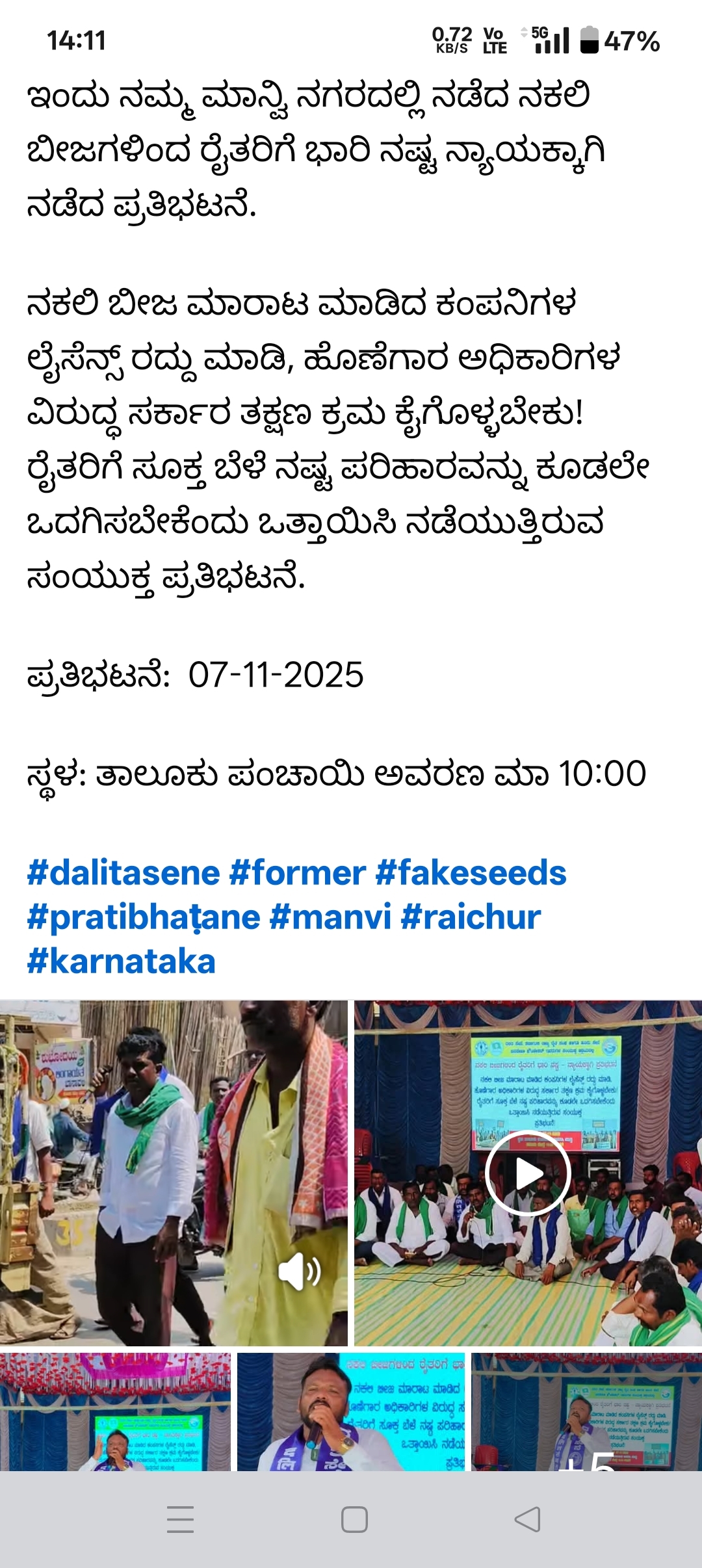ಮಾನವಿ.07 .ಇಂದು ನಮ್ಮ ಮಾನವಿಯಲ್ಲಿ ನಕಲಿ ಬೀಜಗಳು ಮಾರಟ ಮತ್ತು ಅಂಗಡಿಗಳು ಲೈಸೆನ್ಸ್ ರದ್ದು ಮಾಡುಲು ಕುರಿತು ಪ್ರಗತಿ ಪರ ಒಕ್ಕೂಟದ ಸಂಘಟನೆಗಳು ವತಿಯಿಂದ ಧರಣಿ ಮಾಡಲಾಯಿತು