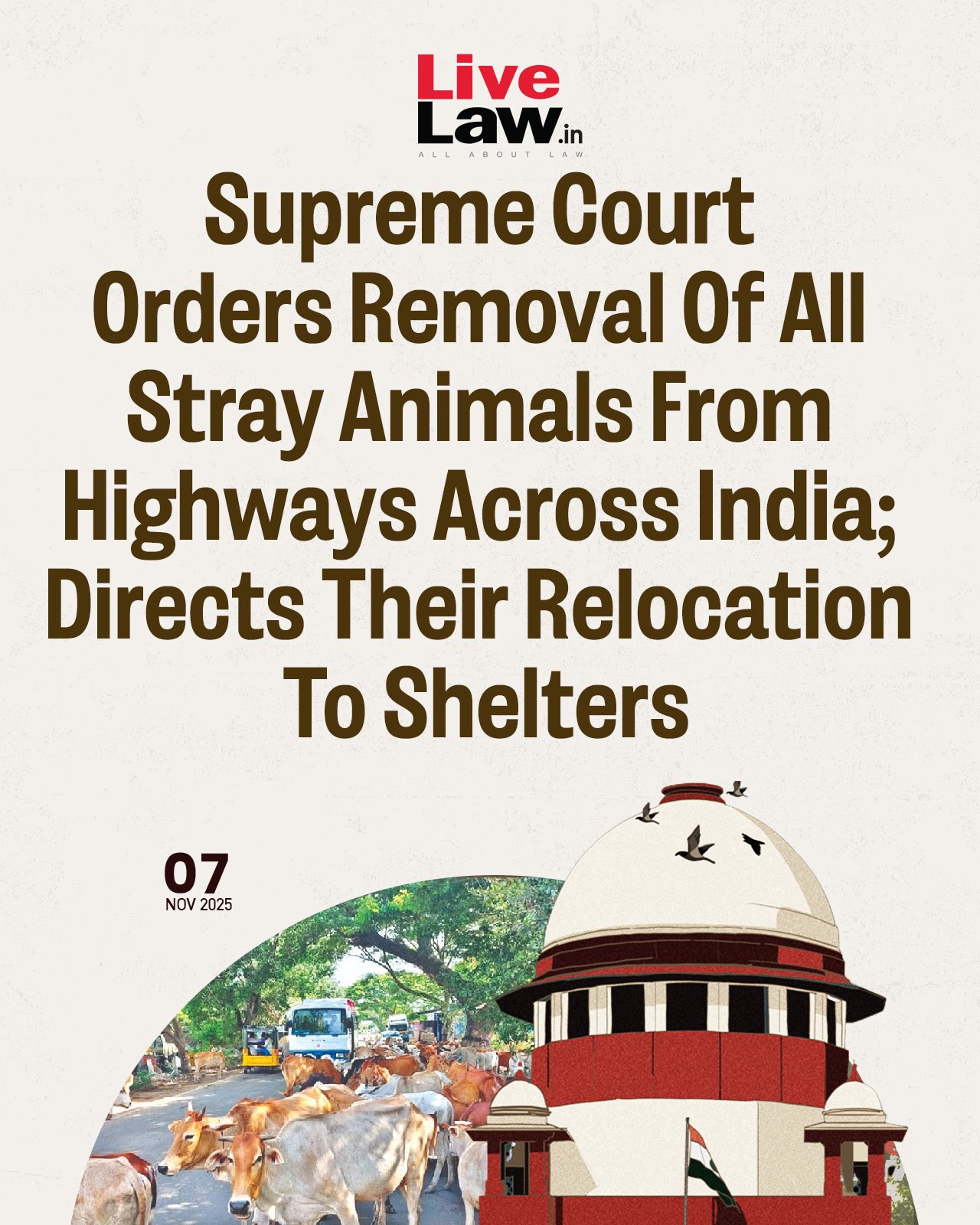 The Supreme Court today ordered national and state authorities to immediately remove all stray animals, including cattle, from highways.