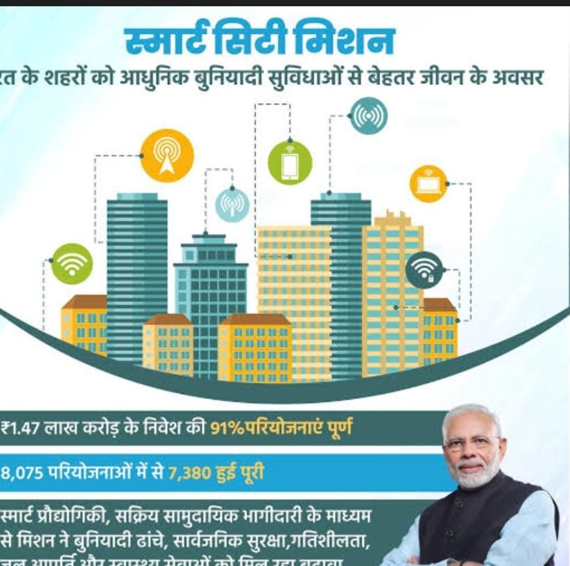 भारत सरकार की महत्वाकांक्षी योजना-स्मार्ट सिटी मिशन के अन्तर्गत देश के चयनित कुल 100 शहरों में उत्तर प्रदेश के 10 शहरों का चयन यथा-लखनऊ, कानपुर, प्रयागराज, वाराणसी, आगरा, अलीगढ़, बरेली, झांसी, सहारनपुर व मुरादाबाद चरणबद्ध रूप से किया गया है। स्मार्ट सिटी के अन्तर्गत विभिन्न 6 श्रेणियों यथा समस्त 10 शहरों हेतु कुल अनुमन्य आउट-ले के सापेक्ष रू0 9330.92 करोड़ की धनराशि से 678 कार्य स्वीकृत है, जिनके सापेक्ष रू0 9066.70 करोड़ की लागत से 674 कार्य पूर्ण एवं रू0 264.22 करोड़ की लागत से 8 कार्य प्रगति पर है।