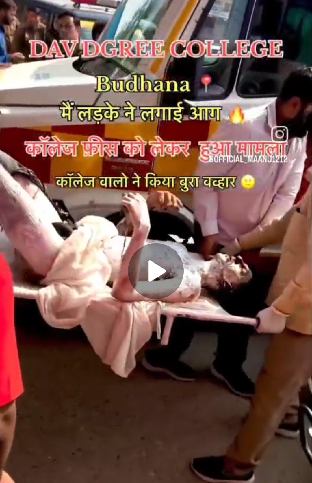 मुज़फ्फरनगर के कस्बा बुढाना में डीएवी डिग्री कॉलेज में फीस ना जमा करने पर छात्र के साथ प्रधानाचार्य ने अपमान जनक शब्दो का किया प्रयोग,जिस पर छात्र ने सोशल मीडिया पर अपनी वीडियो वायरल कर डिग्री कॉलेज में आग लगाकर आत्महत्या करने का प्रयास किया है,आग लगने से छात्र गंभीर रूप से झुलस गया है,आनन फानन में स्कूली छात्रो द्वारा आग बुझाकर छात्र को एक हॉस्पिटल में भर्ती कराया है। जहाँ उसकी हालत गंभीर बतायी जा रही है। बुढाना में डीएवी डिग्री कॉलेज के प्रधानाचार्य व स्कूल प्रशासन द्वारा छात्र के द्वारा फीस जमा ना करने पर कई दिनों से किया जा रहा था अभद्र व्यवहार,जिस पर छात्र पर स्कूल में अपने ऊपर तेल छिड़कर की आत्मदाह की कोशिश,छात्र के उत्पीड़न को लेकर परिजनों व छात्र नेताओं द्वारा स्कूल के सामने किया गया धरना प्रदर्शन।