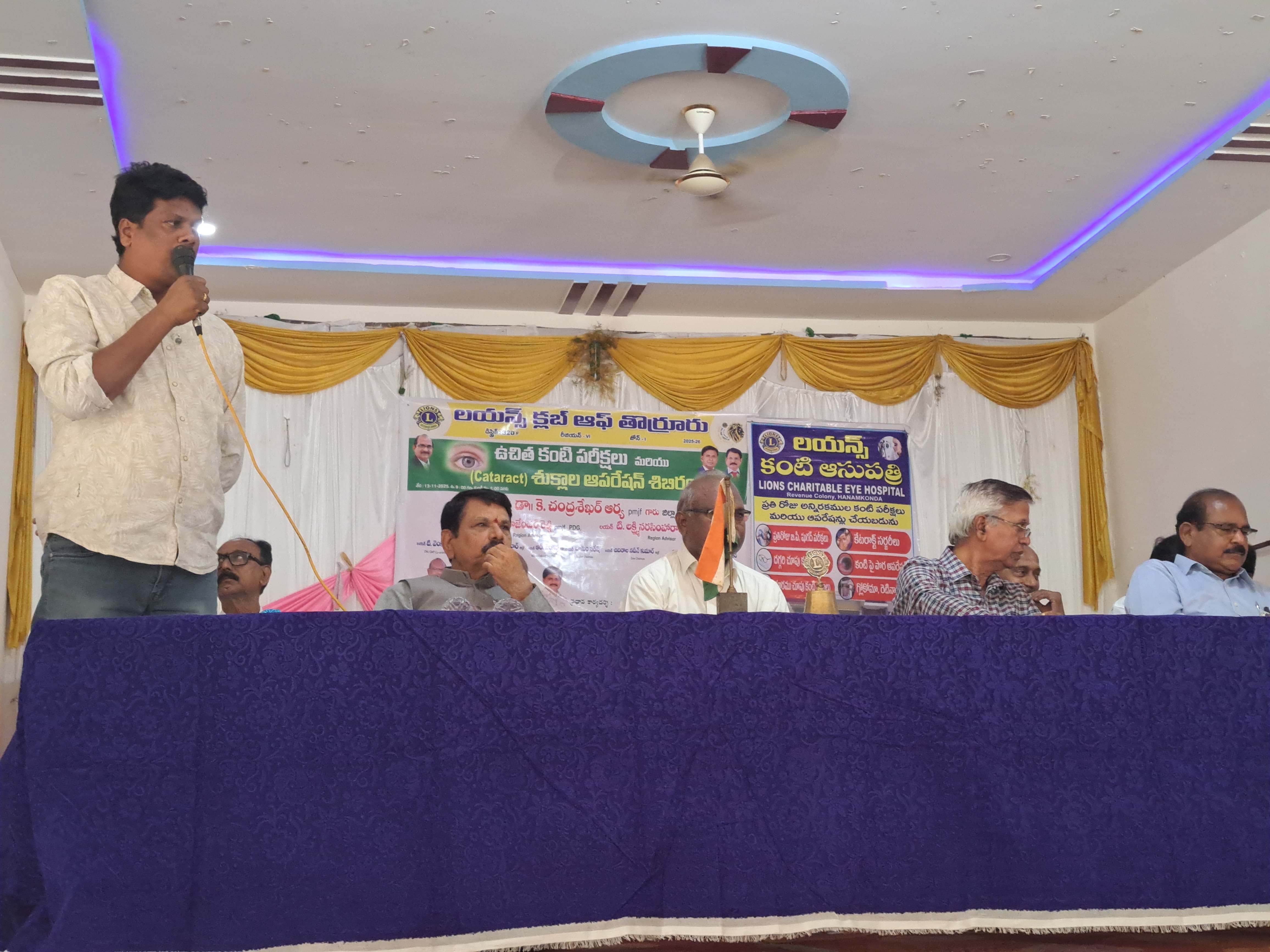 తొర్రూర్ నవంబర్ 13 (AIMEMEDIA) ప్రజలు తమ కళ్ళ ఆరోగ్యం పట్ల అవగాహన కలిగి ఉండాలని లయన్స్ క్లబ్ పూర్వ గవర్నర్ డాక్టర్ కే రాజేందర్ రెడ్డి స్పష్టం చేశారు. గురువారం లైన్స్ క్లబ్ భవనంలో క్లబ్ అధ్యక్షులు డాక్టర్ ఎస్ రామ్ నర్సయ్య అధ్యక్షతన ఉచిత కంటి వైద్య పరీక్షా శిబిరము నిర్వహించారు. శిబిరాన్ని ప్రారంభించిన అనంతరం జరిగిన సమావేశంలో డాక్టర్ రాజేందర్ రెడ్డి మాట్లాడుతూ ప్రజలు కొంత నిర్ణీత వయసు దాటిన తర్వాత తమ నేత్రాల పట్ల శ్రద్ధ వహించాలని పెరుగుతున్న వయసు రీత్య చూపు మందగిస్తుందని, కళ్లకు వచ్చే జబ్బులు ముందుగానే గుర్తించి చికిత్స పొందడం వల్ల తాము జీవించినంత కాలం లోకాన్ని చూస్తారని అశ్రద్ధ వహిస్తే కళ్ళు కోల్పోయే ప్రమాదం కూడా ఉంటుందని ముఖ్యంగా బీ.పీ, షుగర్ ఉన్నవారు ఎప్పటికప్పుడు నేత్ర పరీక్షలు చేయించుకోవాలని సూచించారు .తొర్రూర్ లయన్స్ క్లబ్ వారు విభిన్న కార్యక్రమాలు చేపడుతూ ప్రజల మన్ననలు పొందడం ఎంతో అభినందనీయమన్నారు ఈ సందర్భంగా క్లబ్ అధ్యక్షుడు డాక్టర్ రామ నర్సయ్య మాట్లాడుతూ ఇప్పటివరకు విద్యార్థులకు ,ప్రజలకు అవసరార్థులకు సుమారు 500 కు పైగా వివిధ సేవ కార్యక్రమాలను నిర్వహించామని, ప్రపంచ దయ దినోత్సవం సందర్భంగా ఈ నేత్ర పరీక్ష శిబిరాన్ని లయన్స్ చారిటీ హాస్పిటల్ నిర్వాకులు వేణుగోపాల్ సహకారంతో నిర్వహిస్తున్నామని చెప్పారు. ఈ శిబిరంలో 150 మందికి ఉచిత నేత్ర పరీక్షలు నిర్వహించగా ఇందులో సుమారు 55 మందికి ఆపరేషన్లు చేయాల్సింది అవసరం ఉందని గుర్తించామని వీరిని హనుమకొండ కు తీసుకువెళ్లి ఉచితంగా ఆపరేషన్లను చేయించడం జరుగుతుందని అన్నారు. క్లబ్ సభ్యులు ప్రతి కార్యక్రమంలో పాల్గొంటున్న ప్రతి ఒక్కరికి ధన్యవాదాలు తెలుపుతున్నాను అని అన్నారు. మరో పి డి.జి తమ్మెర నరసింహారావు మాట్లాడుతూ ఇప్పటివరకు నూతన ఒరవడిగా ఎన్నో సేవా కార్యక్రమాలు నిర్వహిస్తూ జిల్లాలో క్లబ్ ముందు ఉండడం ఎంత ప్రశంసనీయమని అన్నారు ఈ కార్యక్రమంలో.ఆర్ సి దామర సురేష్, జోన్ చైర్మన్ చిదిరాల నవీన్ కుమార్, లైన్స్ క్లబ్ సీనియర్ సభ్యులు బాధ్యులు, తమ్మెర విశ్వేశ్వరరావు, డాక్టర్ కే యాదగిరి రెడ్డి,డాక్టర్ పి కిరణ్ కుమార్ , తుమ్మేటి వెంకటరెడ్డి, తమ్మెర వీరభద్రరావు, టి వెంకటేశ్వర్లు, గోపాల్, గోవిందరాజు , కోనే ప్రభాకర్, ఆర్ వెంకన్న, ,కటరమణ రెడ్డి, లైన్స్ క్లబ్ ప్రధాన కార్యదర్శి ముడుపు రవీందర్ రెడ్డి, కోశాధికారి వజినపెళ్లి శ్రీనివాస్, ఎం డీ జలీల్ తదితరులు పాల్గొన్నారు.