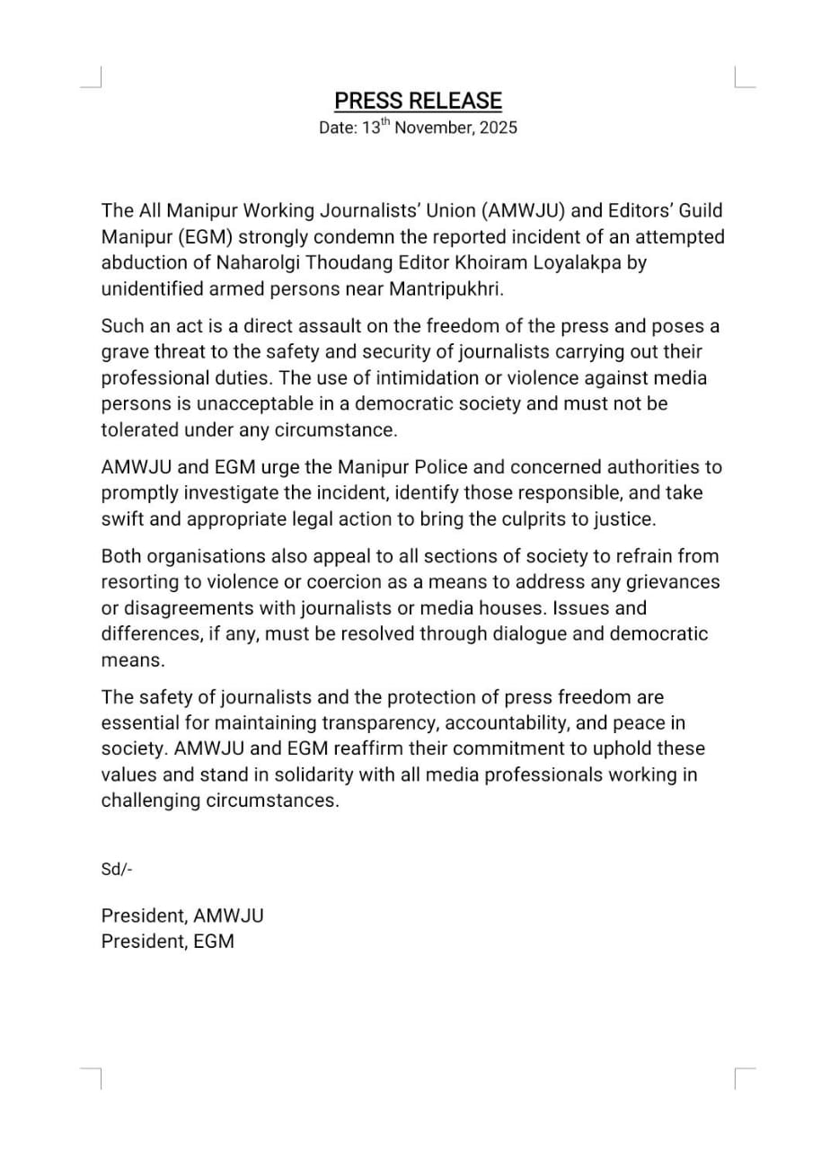 Imphal, India — November 13, 2025: The All Manipur Working Journalists’ Union (AMWJU) and the Editors’ Guild Manipur (EGM) have issued a strong condemnation of the reported attempted abduction of Naharolgi Thoudang Editor Khoiram Loyalakpa by unidentified armed men near Mantripukhri.