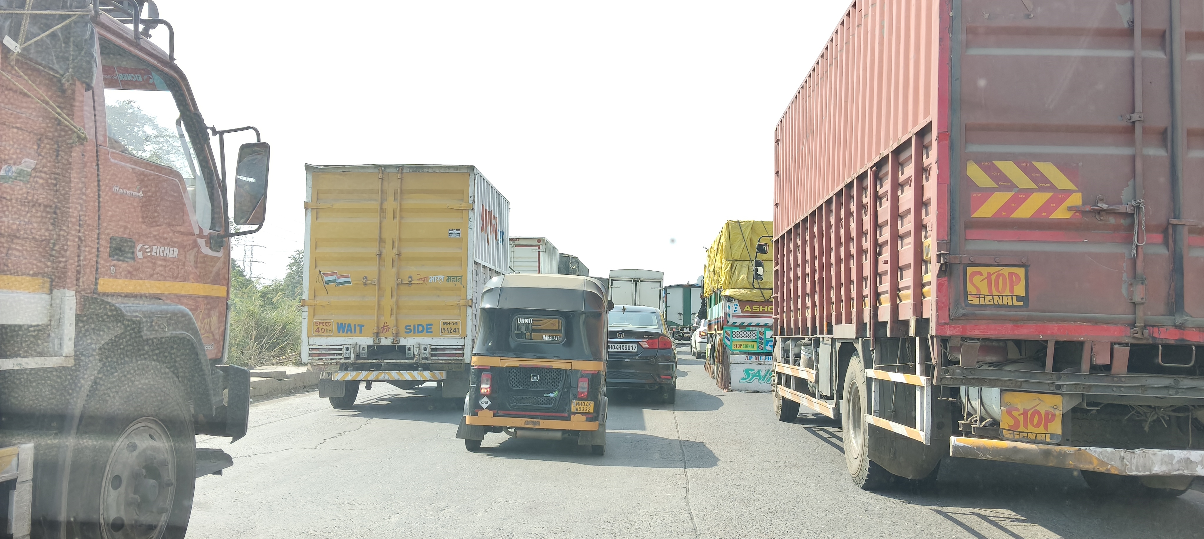 हर रोज़ की तरह जनता का सफर मुश्किल — ट्रकों और गाड़ियों की लंबी कतारें लगातार बढ़ती जा रही हैं।