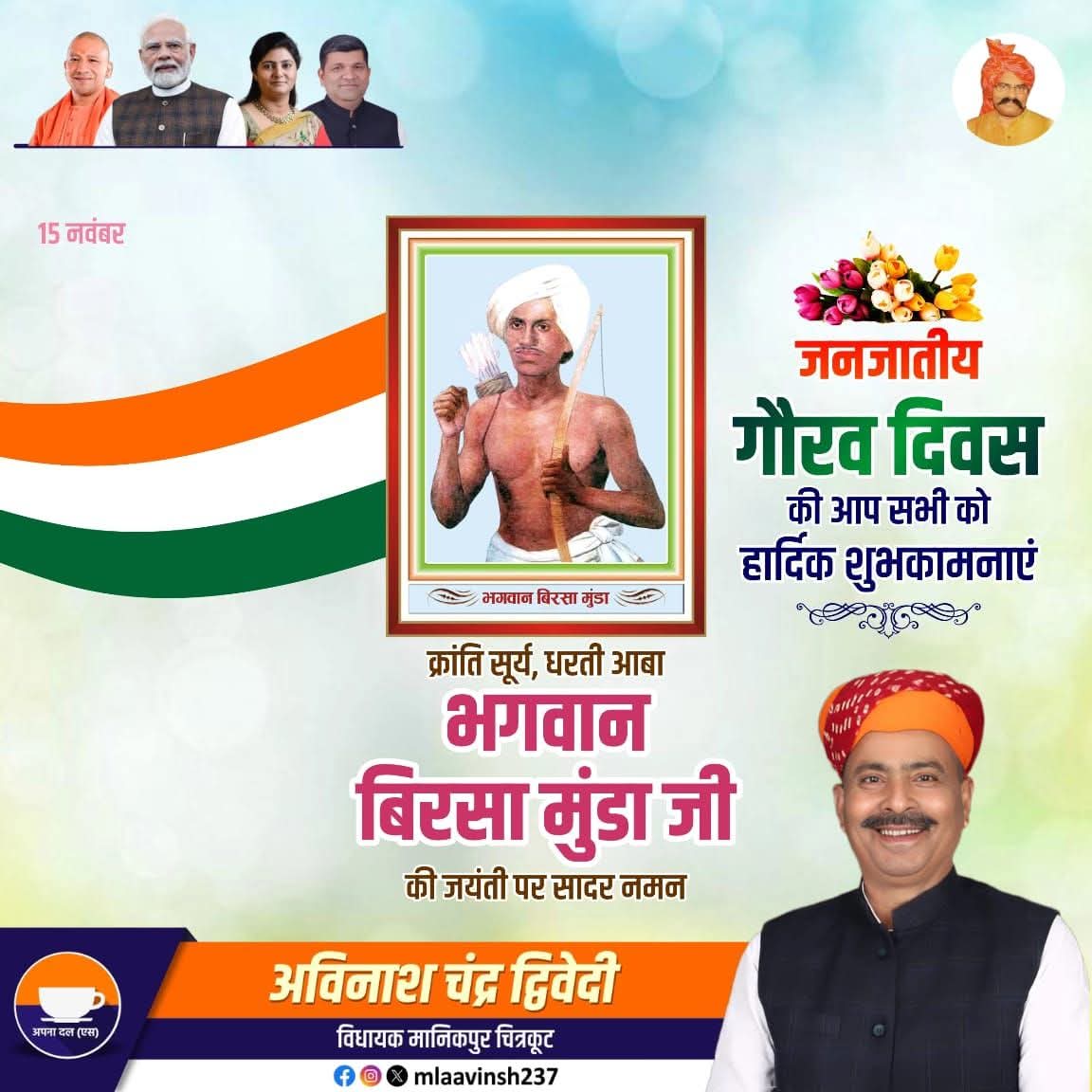 मऊ मानिकपुर विधायक माननीय अविनाश चन्द दुवेदी जी ने 150 वी भगवान बिरसा मुंडा की जयंती पर सभी क्षेत्र के आदिवासी समाज को शुभकामनाये दिये धन्यवाद