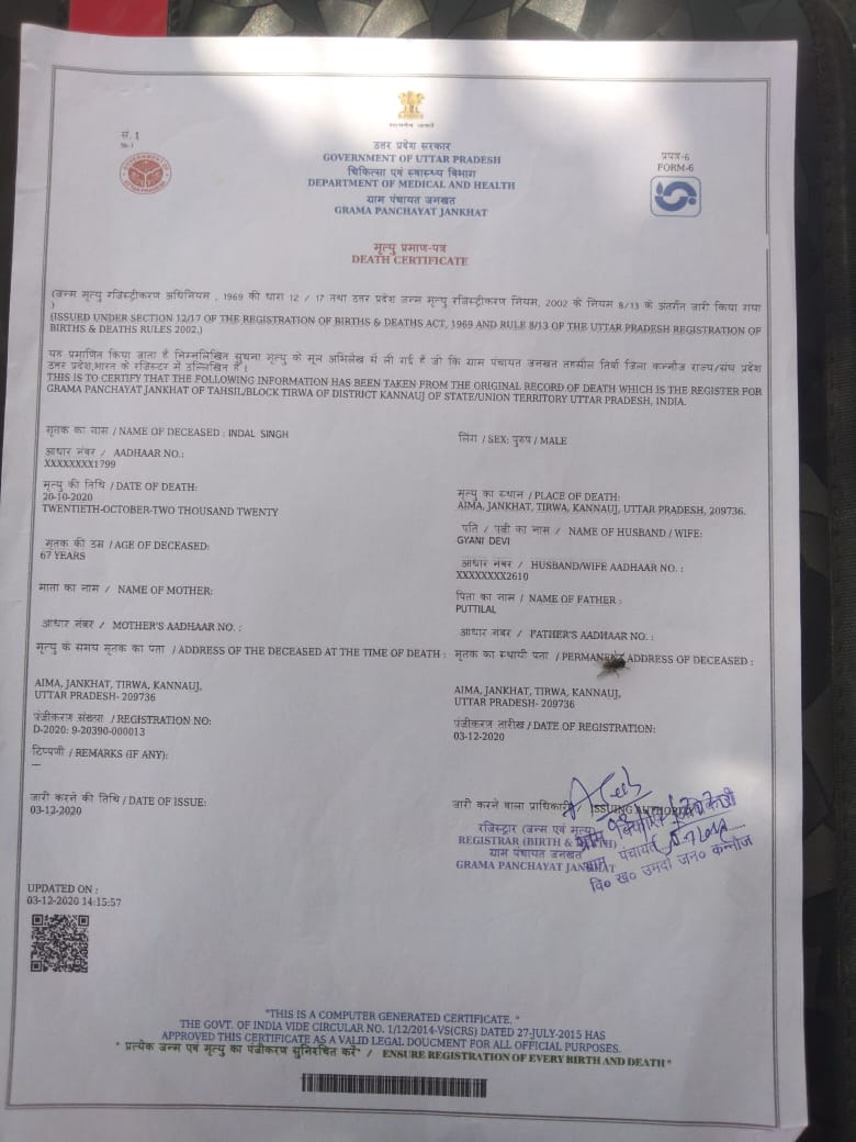 जिला कन्नौज ब्लॉक उमर्दा मनरेगा योजना में मृत्यु व्यक्ति उपस्थित दिखाई अधिकारी मनरेगा में घोटाला सूत्रों ने बताया है कि ऐसे कई व्यक्ति हैं मृत्यु है उनके खाते में मनरेगा रूपये आ रहे हैं UP-68-002-068-001/149 में 5 दिन की उपस्थिति दिखाई गई है मृत्यु प्रमाणपत्र प्राप्त जारी पंजीकरण संख्या D 2020 9-20390-000013