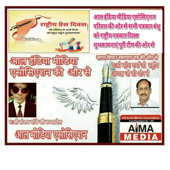 आल इंडिया मीडिया एसोसिएशन परिवार की ओर से सभी पत्रकार बंधु को राष्ट्रीय पत्रकार दिवस की हार्दिक शुभकामनाएं पुरी टीम की ओर से