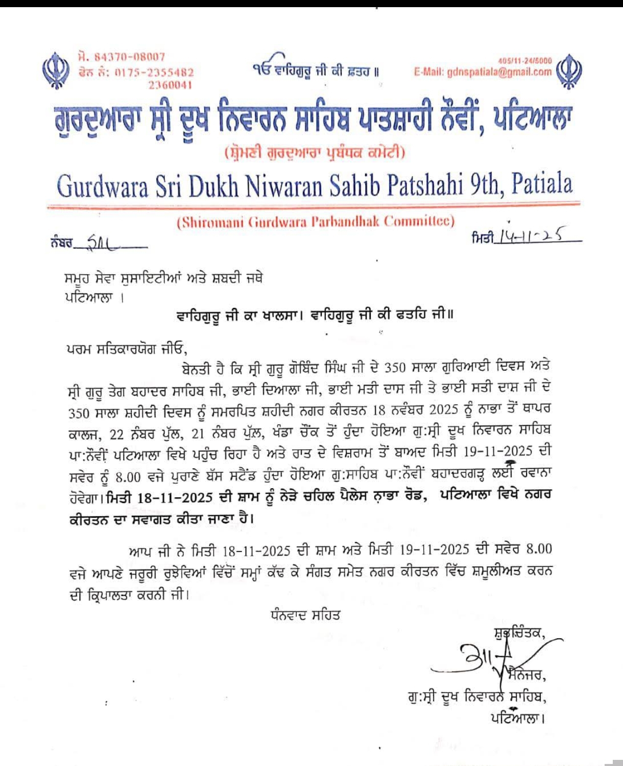 Patiala ch 18 Nov 2025 nu 350 years Martyrdom of Shri Guru Teg Bahadur Sahib Ji, Nagar Kirtan