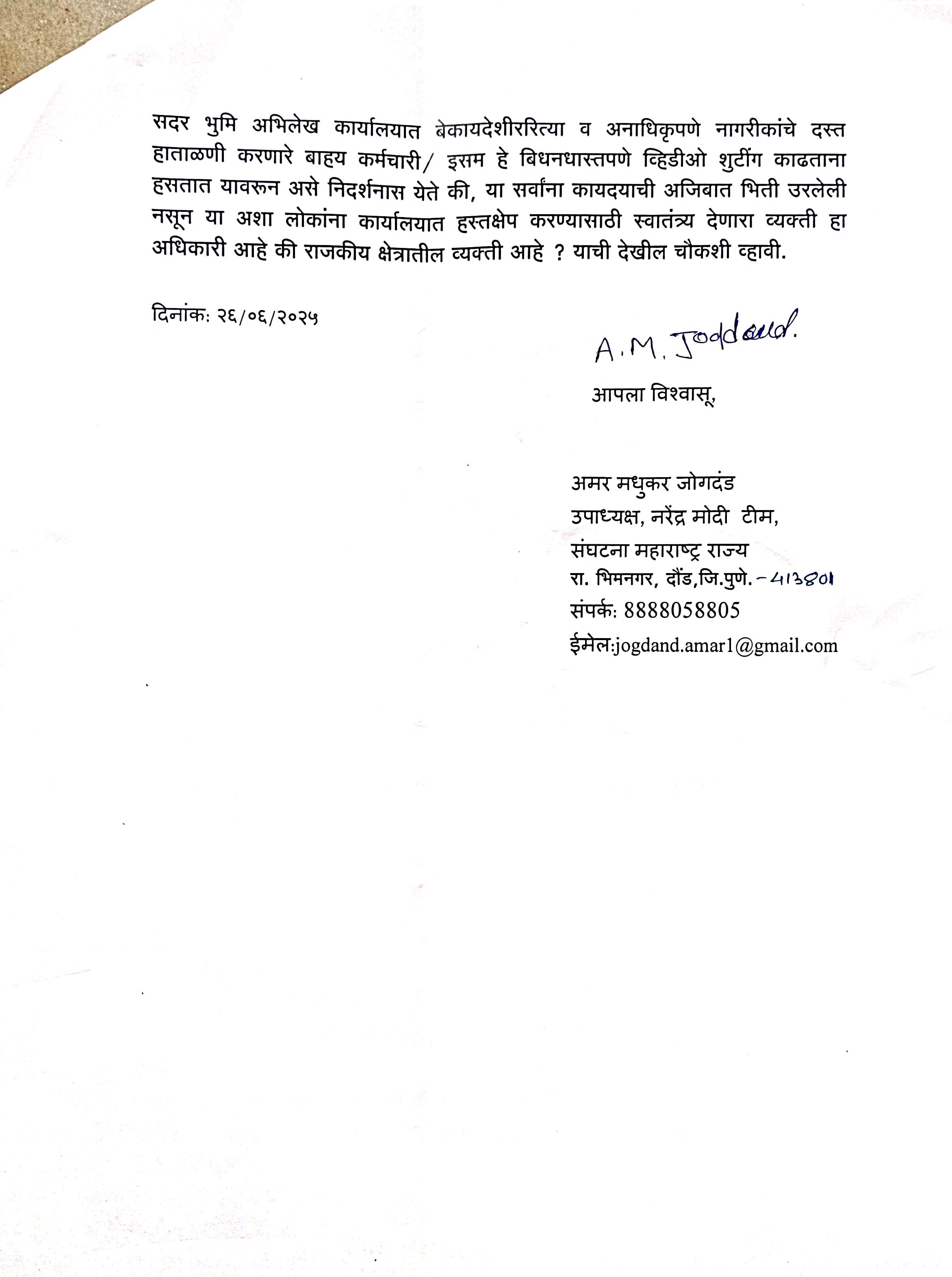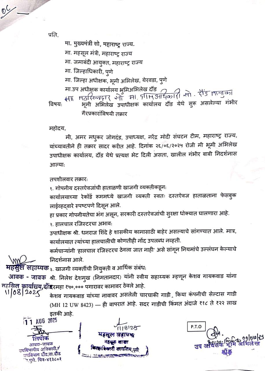 मी, अमर मधुकर जोगदंड, उपाध्यक्ष, नरेंद्र मोदी संघटन टीम, महाराष्ट्र राज्य, यांच्यावतीने ही तक्रार सादर करीत आहे. दिनांक २६/०६/२०२५ रोजी मी भूमी अभिलेख उपाधीक्षक कार्यालय, दौंड येथे प्रत्यक्ष भेट दिली असता, खालील गंभीर बाबी निदर्शनास आल्याः