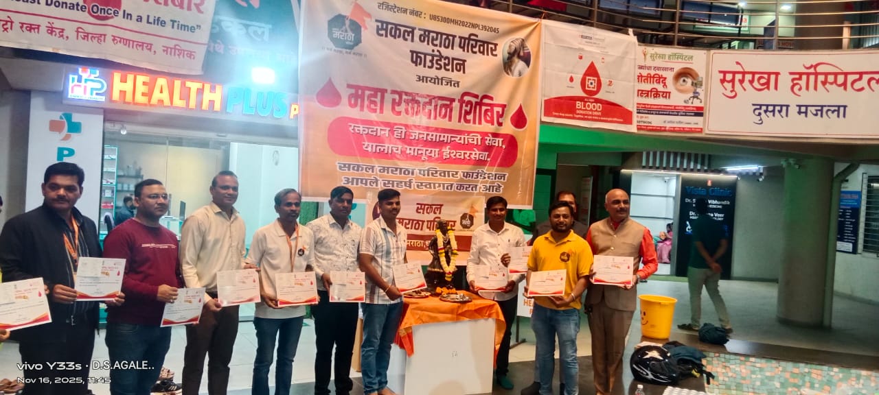 नाशिक : राज्यभरात निर्माण झालेल्या रक्तटंचाईच्या पार्श्वभूमीवर राज्य संक्रमण परिषद, महाराष्ट्र राज्य यांच्या आवाहनानुसार सकल मराठा परिवार तर्फे संपूर्ण महाराष्ट्रात महारक्तदान उपक्रम राबविण्यात येत आहे. त्याचा एक भाग म्हणून नाशिक येथे रेडियंट हॉस्पिटल, रुंगटा बेलाविष्ठा बिल्डिंग, मुंबई नाका येथे रक्तदान शिबिराचे आयोजन करण्यात आले. या शिबिरात एकूण १११ व दिंडोरी या ठिकाणी ५१ रक्तदात्यांनी रक्तदान करत समाजहिताचा दर्जेदार आदर्श ठेवला. या शिबिरासाठी डॉ. नितीन देशमुख रेडियंट हॉस्पिटल टीम यांचे मोलाचे सहकार्य लाभले, मेट्रो रक्त् केंद्र,जिल्हा रुग्णालय नाशिक रक्तपेढीचे विशेष योगदान मिळाले.या शिबिरातील आकर्षण ठरले ते माजी सैनिक श्री. रवींद्र पदाडे यांचे अनुकरणीय योगदान. त्यांनी ७४व्या वेळेस रक्तदान करून रक्तदात्यांसमोर प्रेरणादायी उदाहरण ठेवले. तसेच श्री. सतीश गुंजाळ (३१वे रक्तदान) व श्री. योगेश उगलमूगले (१५वे रक्तदान) यांनीही समाजसेवेचे आपले कार्य पुढे चालू ठेवत उपस्थितांचे लक्ष वेधले.शिबिरात अनेक दाम्पत्यांनी एकत्र येऊन रक्तदान करीत समाजात माणुसकीचा संदेश दिला. त्यात श्री. शरद बोडके – सौ. मनिषा बोडके, श्री. नंदू सोनवणे – सौ. नयना सोनवणे, श्री. रवींद्र सूर्यवंशी – सौ. योगिता सूर्यवंशी या दाम्पत्यांचा समावेश होता.विशेष म्हणजे अशपाक शेख, शेबदाक इकबाल, कैफ मोहम्मद शेख या मुस्लिम बांधवांनीही रक्तदान करून धर्मनिरपेक्ष ऐक्य आणि मानवतेचे मूल्य अधिक बळकट केले. महिलांनीही उत्साहाने सहभाग नोंदवला.काही रक्तदाते वैद्यकीय कारणास्तव रक्तदान करू शकले नसले तरी त्यांची उपस्थिती कौतुकास्पद असल्याचे सकल मराठा परिवारातर्फे सांगण्यात आले.हे शिबीर यशस्वी करण्यासाठी सकल मराठा परिवार नाशिक टीम सर्व सदस्यांनी परिश्रम घेतले.