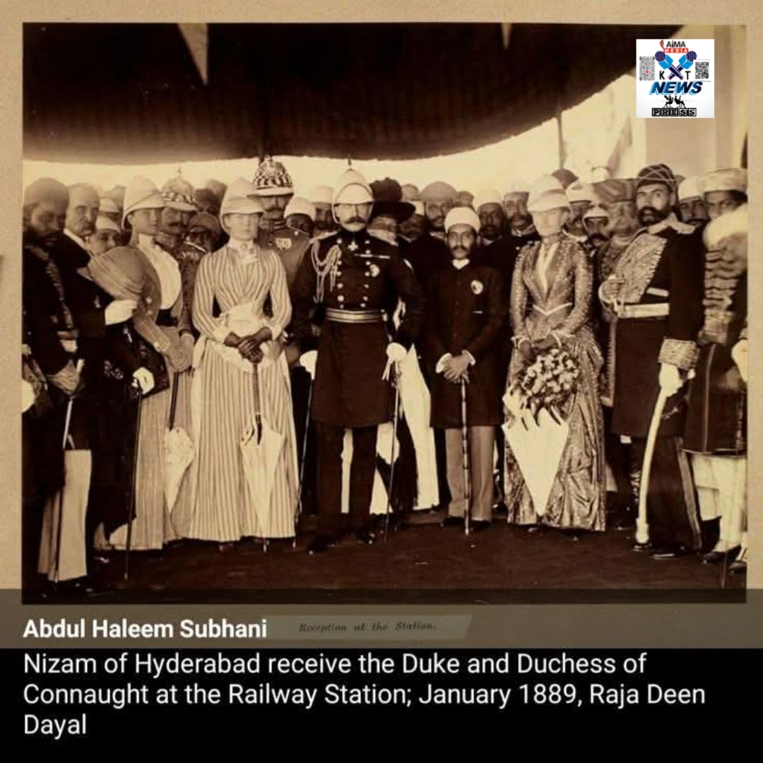 The image captures a historical moment: the Nizam of Hyderabad receiving the Duke and Duchess of Connaught at a railway station.