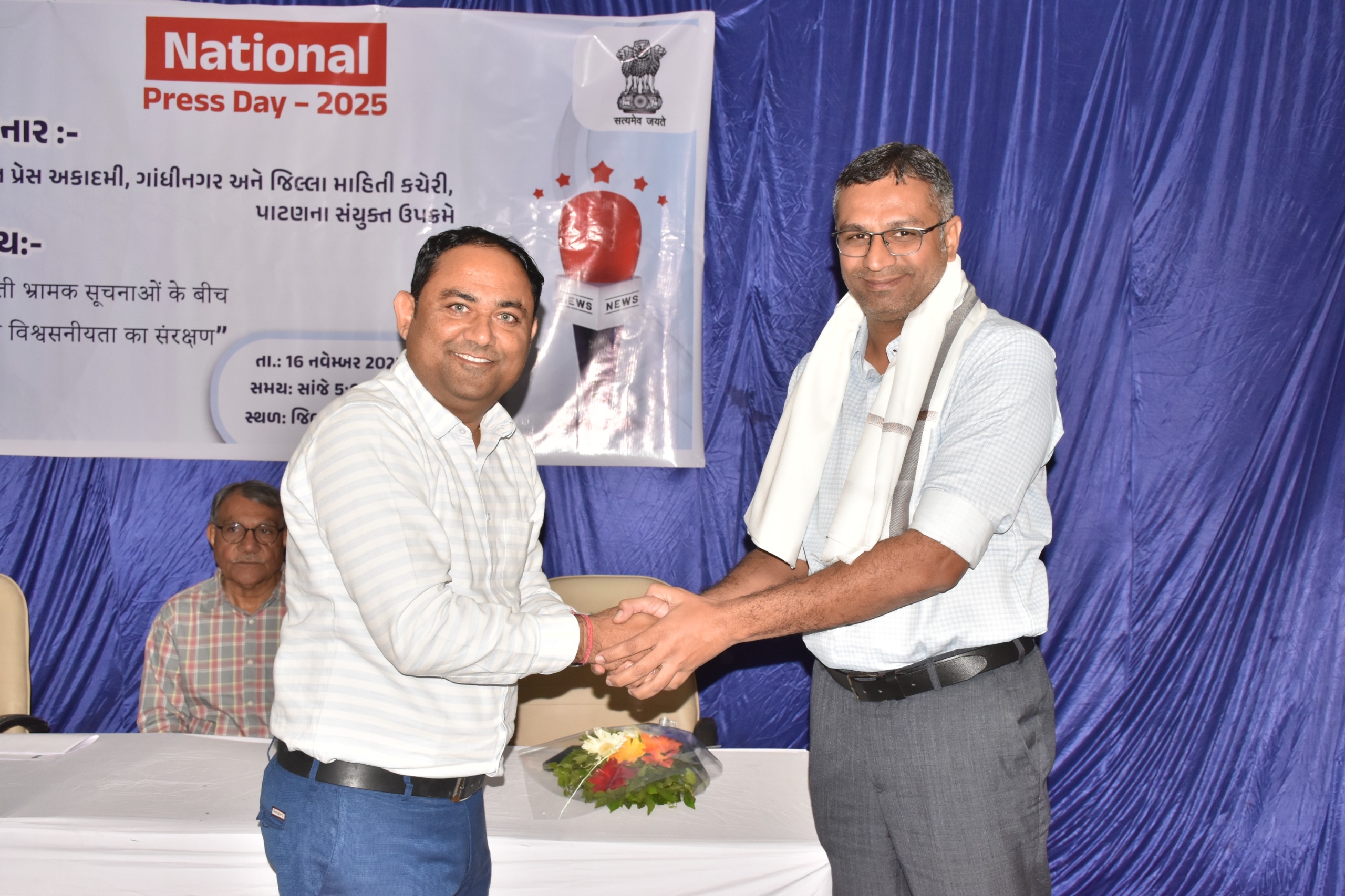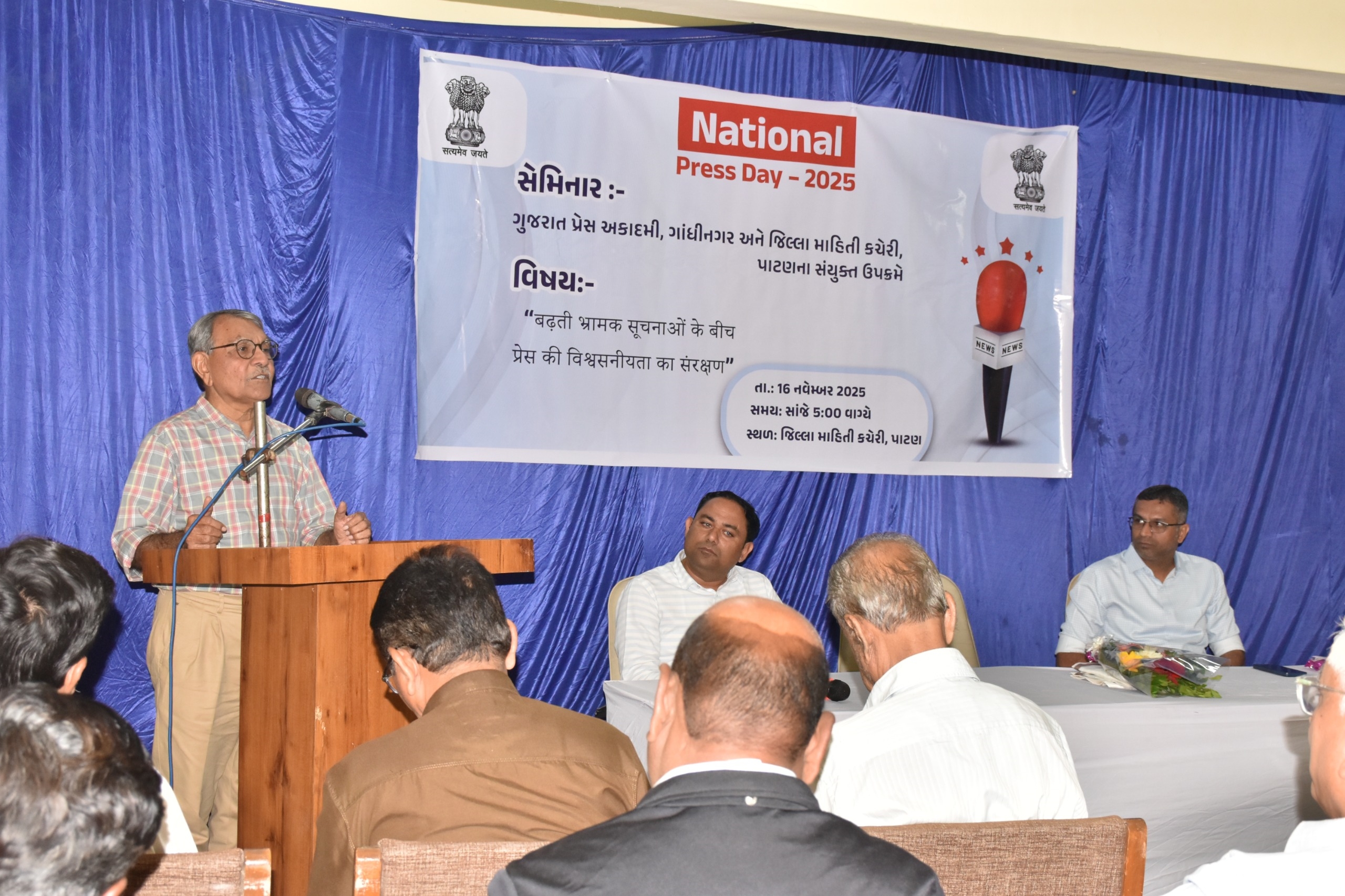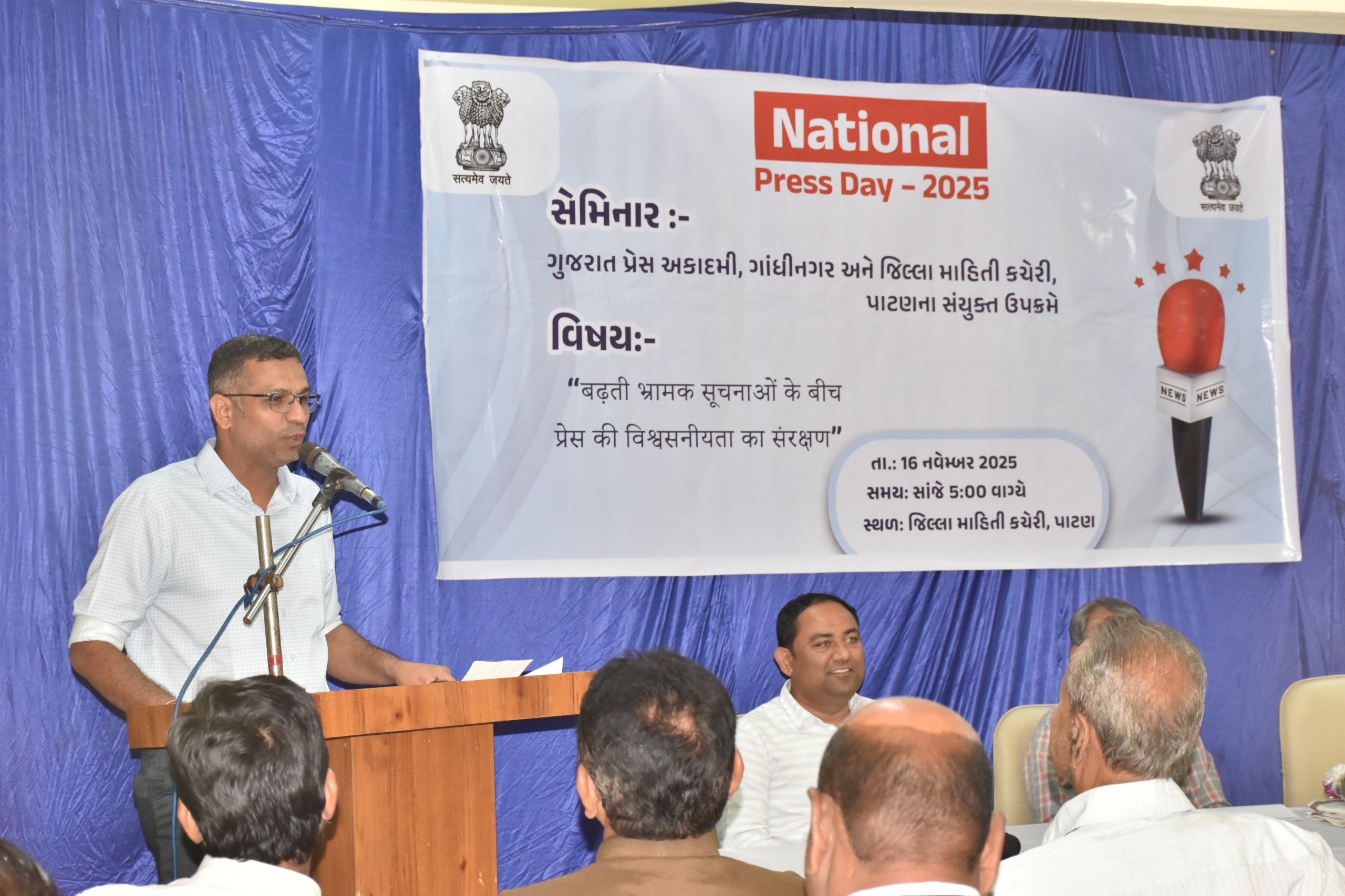 ગુજરાત પ્રેસ અકાદમી, ગાંધીનગર અને જિલ્લા માહિતી કચેરી, પાટણના સંયુક્ત ઉપક્રમે તા. 16 નવેમ્બરે રાષ્ટ્રીય પત્રકારિતા દિવસ (National Press Day) ની ઉજવણી પાટણ ખાતે કરવામાં આવી. આ અવસરે “વધતી ભ્રામક માહિતી વચ્ચે મીડિયાની વિશ્વસનીયતા” વિષય પર પરિસંવાદનું આયોજન કરવામાં આવ્યું.
