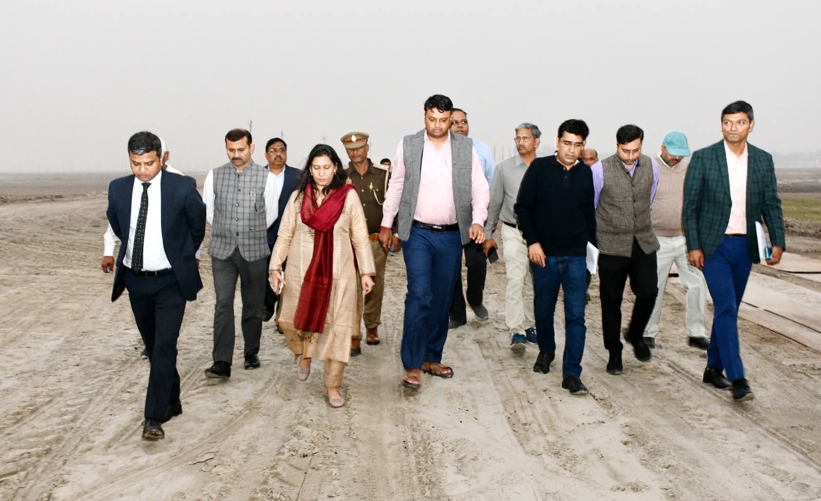 बाढ़ का पानी कम होने के पश्चात विभिन्न सेक्टरों में उपलब्ध हुई भूमि पर माघ मेला 2026 के दृष्टिगत कराए जा रहे लेवलिंग, सड़क, विद्युत एवं अन्य कार्यों का निरीक्षण आज मंडलायुक्त श्रीमती सौम्या अग्रवाल ने जिलाधिकारी श्री मनीष कुमार वर्मा, प्रभारी अधिकारी, माघ मेला, श्री ऋषिराज, अपर मेला अधिकारी श्री दयानंद प्रसाद तथा अन्य सभी संबंधित अधिकारियों की उपस्थिति में किया। उन्होंने सर्वप्रथम शास्त्री ब्रिज पर जाकर ब्रिज के दोनों तरफ उपलब्ध भूमि का आकंलन किया। तत्पश्चात् ओल्ड जीटी एवं छतनाग घाट के समीप उपलब्ध भूमि का भी निरीक्षण कर कार्यों की प्रगति के बारे में संबंधित अधिकारियों से जानकारी ली।