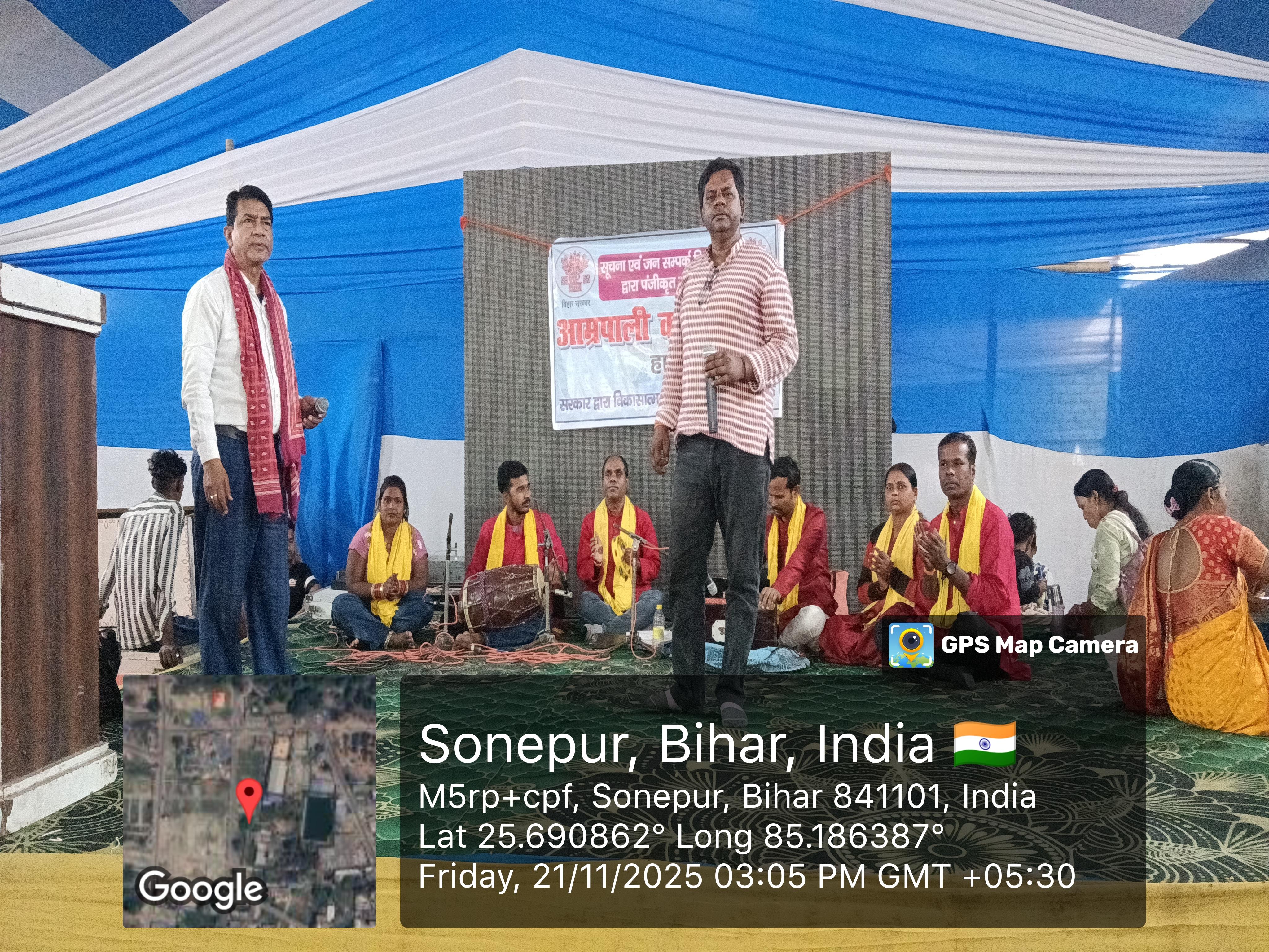 सूचना जनसंपर्क विभाग छपरा सारण के दिशा निर्देश के आलोक में आज आम्रपाली कलाजत्था हाजीपुर वैशाली के कलाकारों द्वारा ग्राम श्री मंडप, सोनपुर में संस्कृतिक कार्यक्रम एवं नुक्कड़ नाटक की प्रस्तुति दो सत्रों में आयोजित की गई प्रथम सत्र में लोक गायक अभय सिंह दादा शिव भजन के साथ रऊए शरण्ईया में बनी हे शिव शंकर दानी दूसरी प्रस्तुति देना हो तो दीजिए जनम-जनम का साथ गाकर समा बांधा तो नशा न करना मान लो कहना, जगह-जगह पर ए भैया पेड़ पौधा लगवा लोग गायक लालमोहन चौहान की प्रस्तुति हुई वहीं लोक गायक अनिल दीवाना ने जहिया से गइले मधुवनवा की प्रस्तुति की गई नशा मुक्ति पर आधारित नाटक की प्रस्तुति कर दर्शकों से तालियां बटोरी मंच का संचालन आम्रपाली कला जत्था के सचिव उद्घोषक बिट्ठल नाथ सूर्य ने संभाला। नाटक का कथा कर नाटक का कथा सार नशा के आदी हो चुके दुनियादारी छोड़कर सिर्फ नशा में पड़ा रहता है भाव की जिंदगी में जीता उसके परिवार में छोटा पुत्र इलाज के अभाव में मर जाता है तब उसकी आंखें खुलती है पुत्र को खोकर समाज में शपथ लेता है कि मैं आज से नशा नहीं करूंगा। पात्र परिचय में शराबी की भूमिका में रवि शंकर पासवान, पत्नी की भूमिका में सावित्री कुमारी, बेटी की भूमिका में सीमा कुमारी ,बेटा की भूमिका में नरोत्तम सूर्या, नाल वादक राजू कुमार इफेक्ट रवि शंकर, सोनू बाबू, आदि कलाकारों का सराहनीय योगदान रहा।