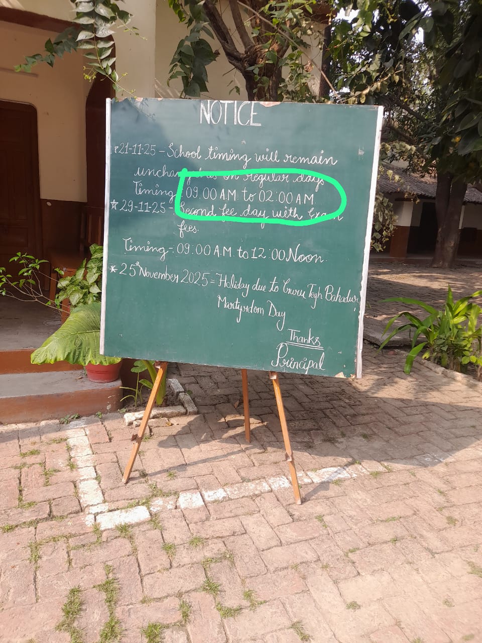 हरदोई, प्रिंसीपल के निर्देश पर मैनेजमेंट स्टाफ द्वारा नोटिस बोर्ड पर लिखी गई समय-सारिणी में स्कूल खुलने का समय सुबह 10:00 बजे तथा छुट्टी का समय रात्रि 02:00 बजे अंकित किया गया है।