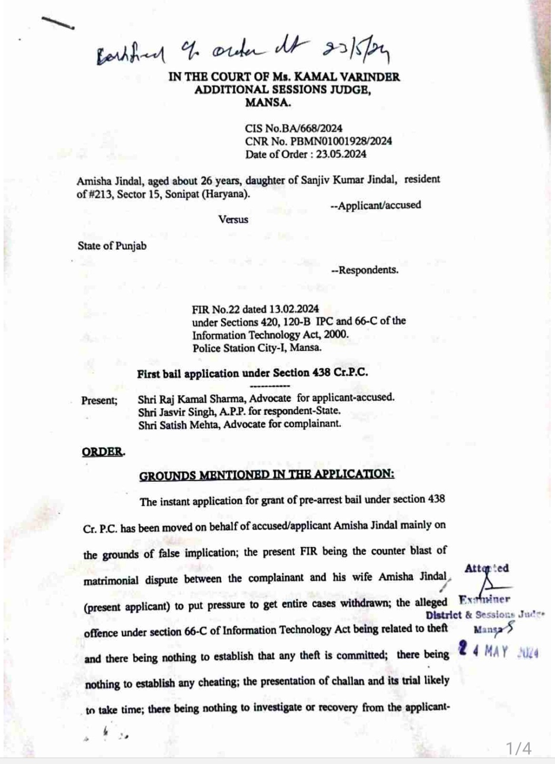 MS. Kamal Varinder Additional session Judge, Amritsar Punjab FIR- 22/2024 Mansa Rishwat 10 Lakh Le ke bail cancel kari of Amisha Jindal
