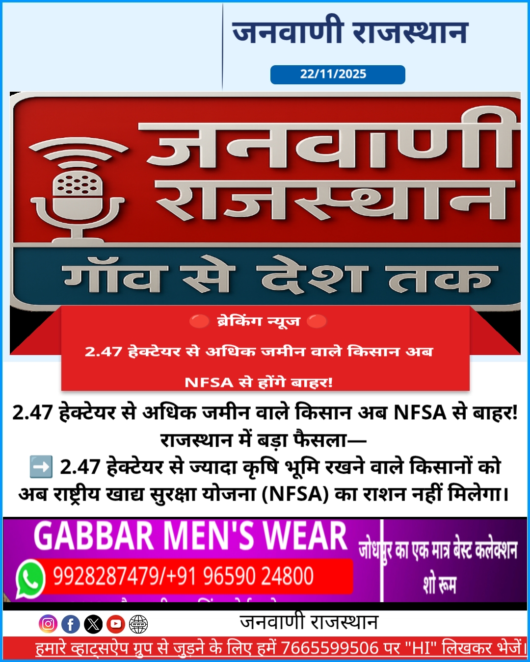 ЁЯФ┤ рдмреНрд░реЗрдХрд┐рдВрдЧ рдиреНрдпреВрдЬ ЁЯФ┤ 2.47 рд╣реЗрдХреНрдЯреЗрдпрд░ рд╕реЗ рдЕрдзрд┐рдХ рдЬрдореАрди рд╡рд╛рд▓реЗ рдХрд┐рд╕рд╛рди рдЕрдм NFSA рд╕реЗ рдмрд╛рд╣рд░!