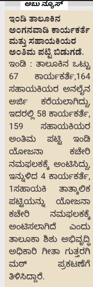 ಇಂಡಿ ತಾಲೂಕಿನ ಅಂಗನವಾಡಿ ಕಾರ್ಯಕರ್ತೆ ಹಾಗೂ ಸಸಹಾಯಕಿಯರ ಅಂತಿಮ ಪಟ್ಟಿ ಬಿಡುಗಡೆ