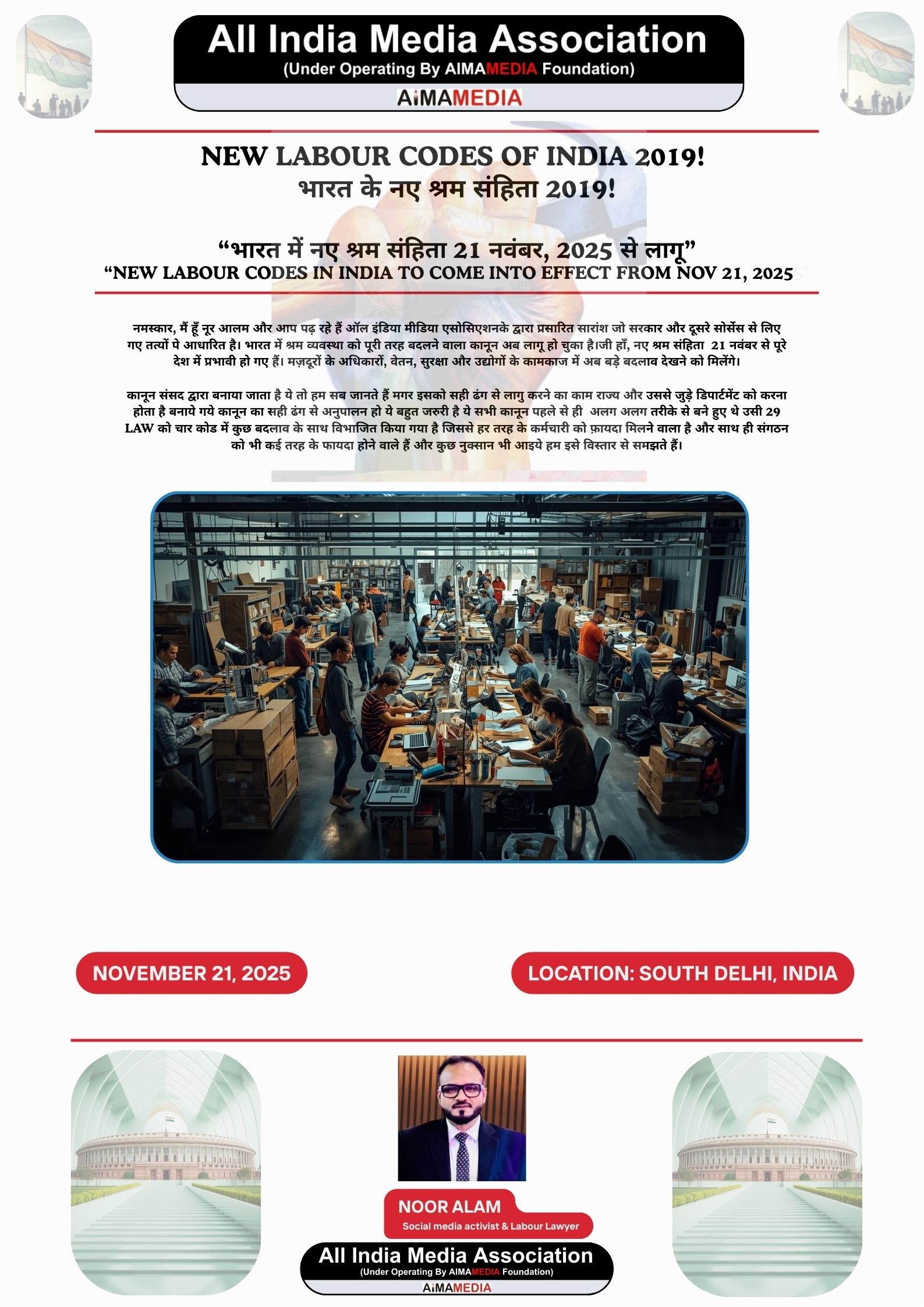 рдирдорд╕реНрдХрд╛рд░, рдореИрдВ рд╣реВрдБ рдиреВрд░ рдЖрд▓рдо рдФрд░ рдЖрдк рдкреЭ рд░рд╣реЗ рд╣реИрдВ рдСрд▓ рдЗрдВрдбрд┐рдпрд╛ рдореАрдбрд┐рдпрд╛ рдПрд╕реЛрд╕рд┐рдПрд╢рди рдХреЗ рджреНрд╡рд╛рд░рд╛ рдкреНрд░рд╕рд╛рд░рд┐рдд рд╕рд╛рд░рд╛рдВрд╢ рдЬреЛ рд╕рд░рдХрд╛рд░ рдФрд░ рджреВрд╕рд░реЗ рд╕реЛрд░реНрд╕реЗрд╕ рд╕реЗ рд▓рд┐рдП рдЧрдП рддрд╛рддреНрдпреЛрдВ рдкреЗ рдЖрдзрд╛рд░рд┐рдд рд╣реИред рднрд╛рд░рдд рдореЗрдВ рд╢реНрд░рдо рд╡реНрдпрд╡рд╕реНрдерд╛ рдХреЛ рдкреВрд░реА рддрд░рд╣ рдмрджрд▓рдиреЗ рд╡рд╛рд▓рд╛ рдХрд╛рдиреВрди рдЕрдм рд▓рд╛рдЧреВ рд╣реЛ рдЪреБрдХрд╛ рд╣реИредрдЬреА рд╣рд╛рдБ, рдирдпреЗ рд▓реЗрдмрд░ рдХреЛрдбреНрд╕ рдСрдлрд╝ рдЗрдВрдбрд┐рдпрд╛ 21 рдирд╡рдВрдмрд░ рд╕реЗ рдкреВрд░реЗ рджреЗрд╢ рдореЗрдВ рдкреНрд░рднрд╛рд╡реА рд╣реЛ рдЧрдП рд╣реИрдВред