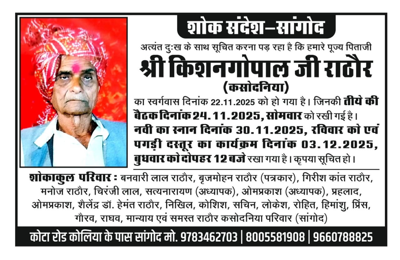 सांगोद-नगर के वरिष्ठ पत्रकार बृज मोहन राठौर के पिता किशन गोपाल राठौर का शनिवार को आकस्मिक निधन हो गया। उनके निधन से परिवार जनों, समाज बंधुओ में शोक की लहर दौड़ गई। दोपहर के लगभग उनका शरीर पांच तत्वों में विलीन कर दिया गया। जानकारी के लिए बता दें कोलियों का बड़ निवासी वरिष्ठ पत्रकार बृज मोहन राठौर को पितृ शोक हुआ है।