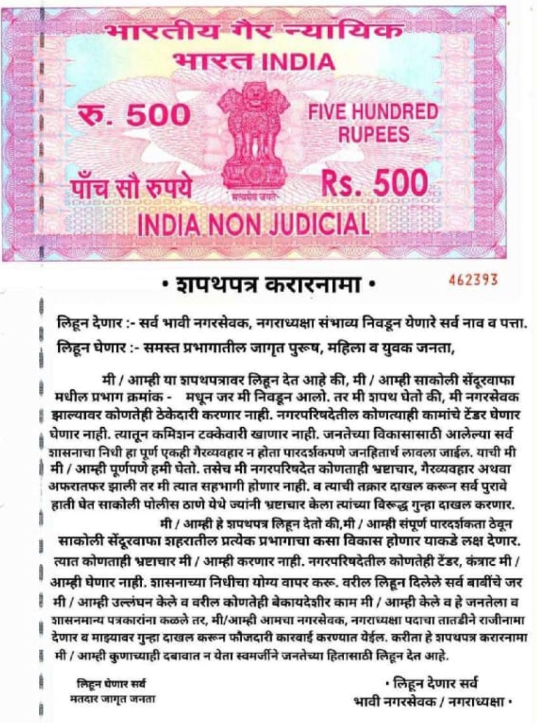 рд╕рд╛рдХреЛрд▓реА: рдирдЧрд░рдкрд░рд┐рд╖рдж рдЪреБрдирд╛рд╡ рдЪреНрдпрд╛ рдЖрдзреА рд╕рд╛рдХреЛрд▓реА рд╢рд╣рд░рд╛рдд тВ╣500 рдЪреНрдпрд╛ рд╕реНрдЯрд╛рдореНрдк рдкреЗрдкрд░ рдкрд░ рд╢рдкрде рд▓рд┐рд╣рд▓реЗ рдЧреЗрд▓реЗ тАЬрд╢рдкрдердкрддреНрд░ рдХрд░рд╛рд░рдирд╛рдорд╛тАЭ рдЬреЛрд░рд╛рдиреЗ рд╡рд╛рдЗрд░рд▓ рд╣реЛрдд рдЖрд╣реЗ ред рдпрд╛ рд╢рдкрдердкрддреНрд░ рдиреЗ рдкреВрд░реНрдг рд╢рд╣рд░рдЪреНрдпрд╛ рд░рд╛рдЬрдиреАрддрд┐рдХ рдордзреНрдпреЗ рдорд╛рд╣реМрд▓ рдЧрд░реНрдо рдЭрд╛рд▓реЗ рдЖрд╣реЗ ред рднрд╛рд╡реА рдирдЧрд░рд╕реЗрд╡рдХ рддрдерд╛ рдирдЧрд░рд╛рдзреНрдпрдХреНрд╖ рдкрдж рдЪреНрдпрд╛ рдЗрдЪреНрдЫреБрдХ рдЙрдореНрдореАрджрд╡рд╛рд░рд╛рдВрдЪреНрдпрд╛ рдЕрди рдЬрдирддрд╛ рд╕рдореЛрд░ рдЕрдиреЗрдХ рдХрдареЛрд░, рдкрд╛рд░рджрд░реНрд╢реА рдФрд░ рдЬрд╡рд╛рдмрджрд╛рд░ рд╡рдЪрди рджрд┐рд▓реЗ рдЖрд╣реЗрдд.