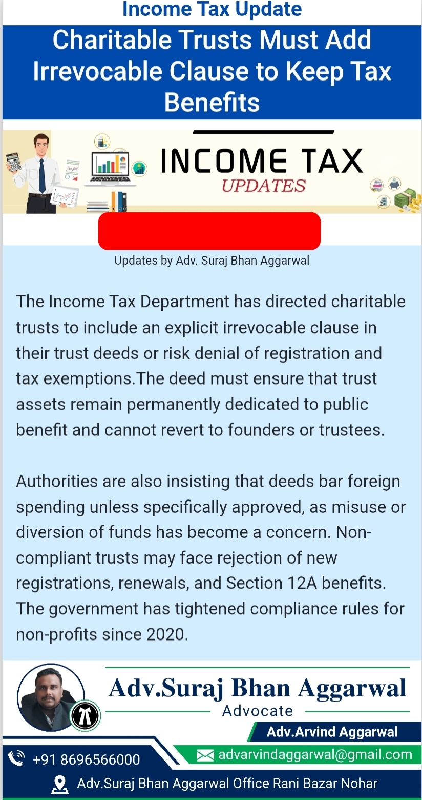 देश में चल रहे चैरिटेबल ट्रस्टों और गैर-लाभकारी संस्थाओं (NGOs) के लिए आयकर विभाग ने एक बड़ा निर्देश जारी किया है। नई गाइडलाइनों के मुताबिक, हर ट्रस्ट को अपनी ट्रस्ट डीड में एक स्पष्ट और अनिवार्य ‘अपरिवर्तनीय (Irrevocable) क्लॉज’ शामिल करना होगा, अन्यथा संगठन को पंजीकरण और Section 12A के तहत मिलने वाली टैक्स छूट से वंचित किया जा सकता है।