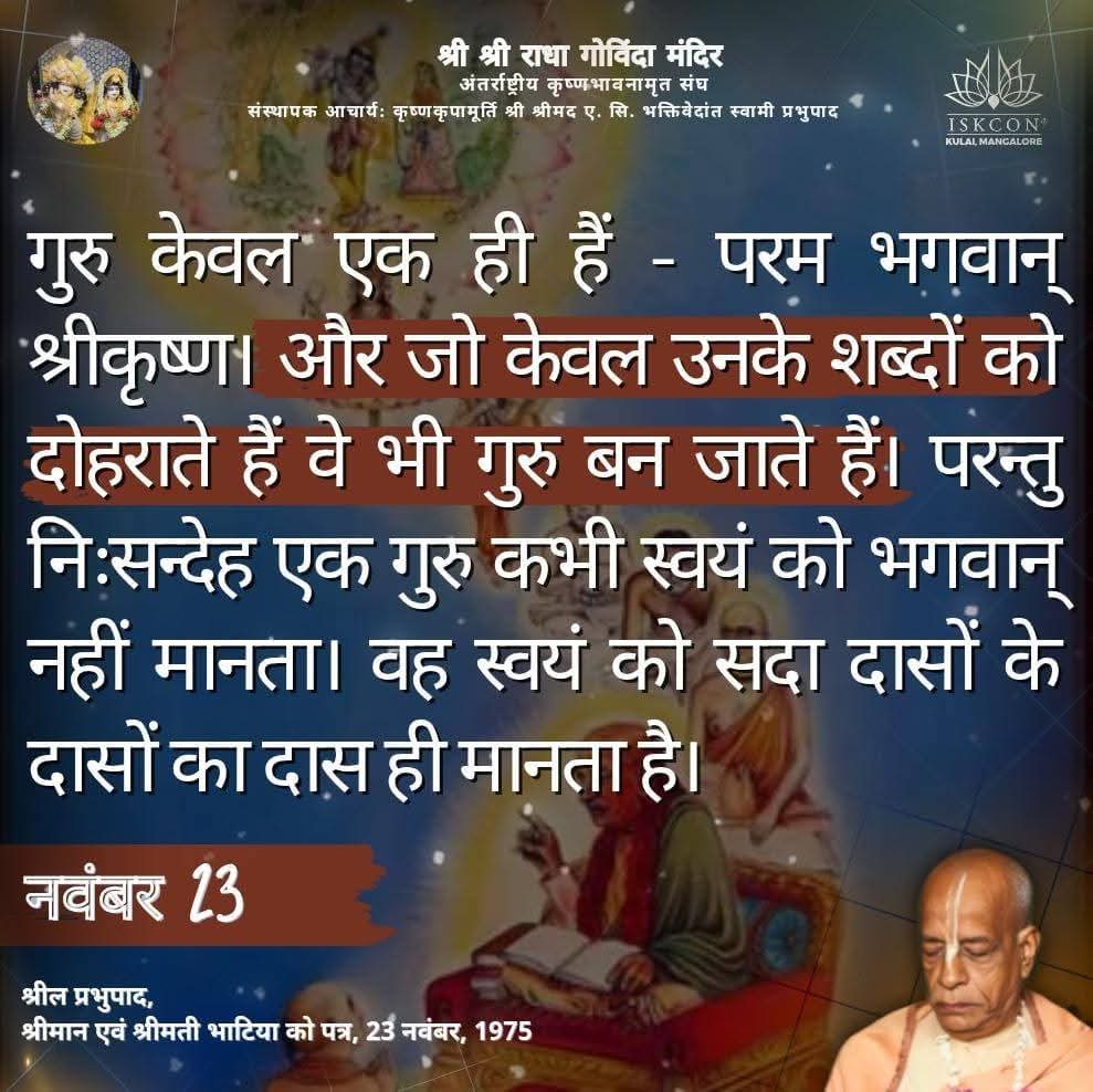 गुरु केवल एक ही हैं - परम भगवान् श्रीकृष्ण। और जो केवल उनके शब्दों को दोहराते हैं वे भी गुरु बन जाते हैं। परन्तु निःसन्देह एक गुरु कभी स्वयं को भगवान् नहीं मानता। वह स्वयं को सदा दासों के दासों का दास ही मानता है।