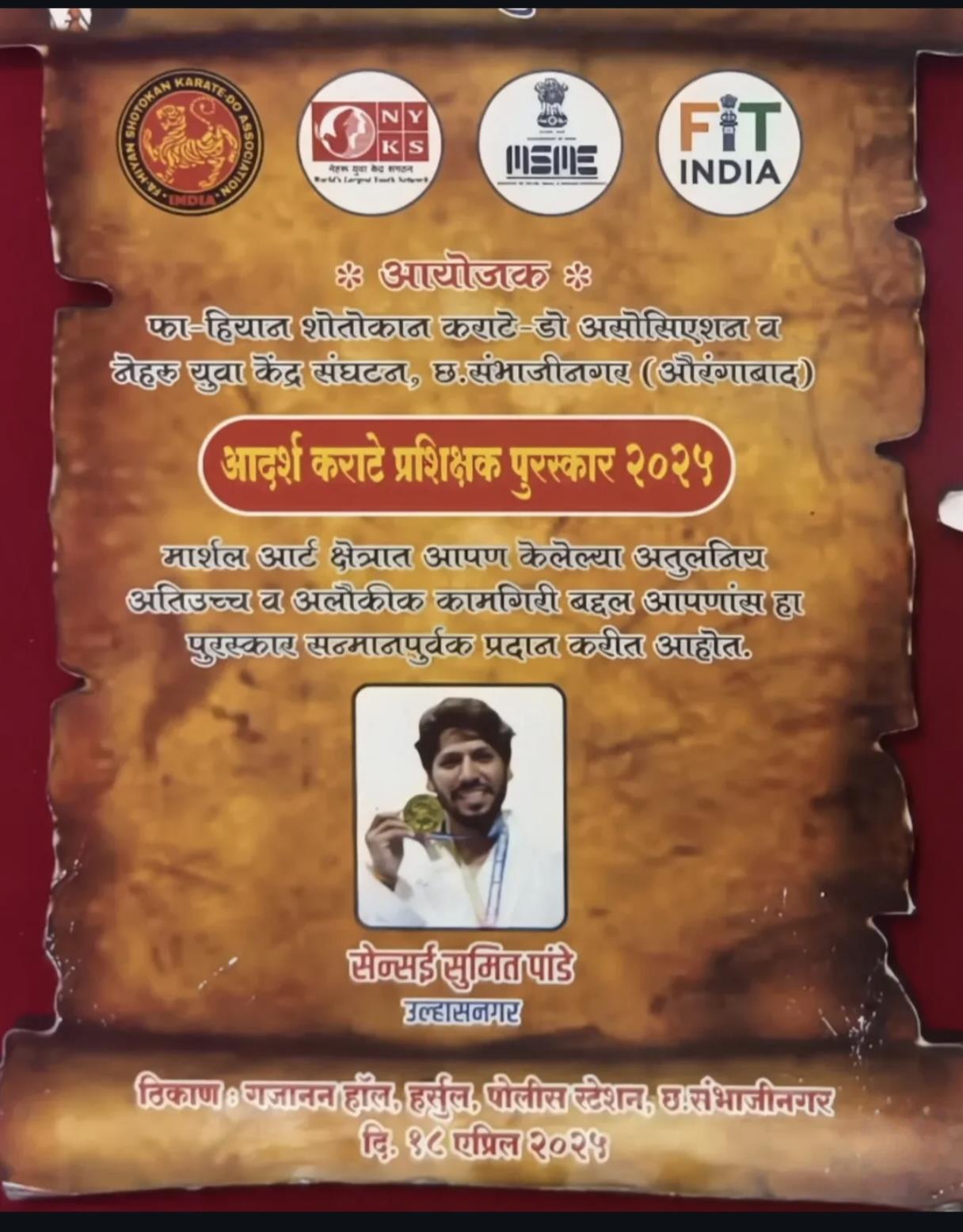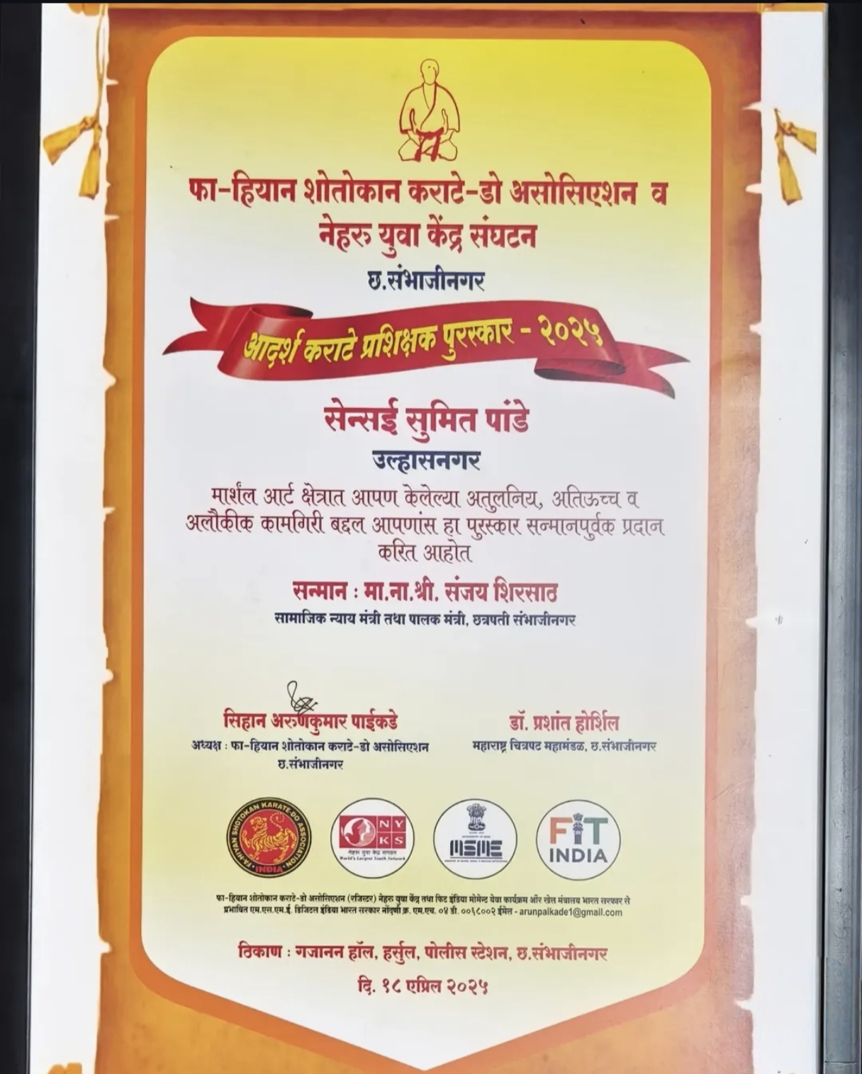 In a proud and inspiring moment for the Martial Arts community, **Sensei Sumit Pandey from Ulhasnagar**, widely respected as the **Karate King**, has been honoured with the "आदर्श कराटे प्रशिक्षक पुरस्कार – 2025" by the **फा–हियान शोतोकान कराटे–दो असोसिएशन व नेहरू युवा केंद्र संघटन, छ. संभाजीनगर**.