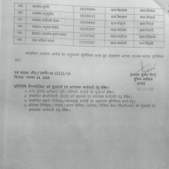 #हरदोई एसपी अशोक कुमार मीणा ने 164 पुलिस कर्मियों के किए तबादले, 2 वर्ष से ज्यादा समय से थानों में तैनात पुलिसकर्मियों के कार्यक्षेत्र में किया बदलाव...