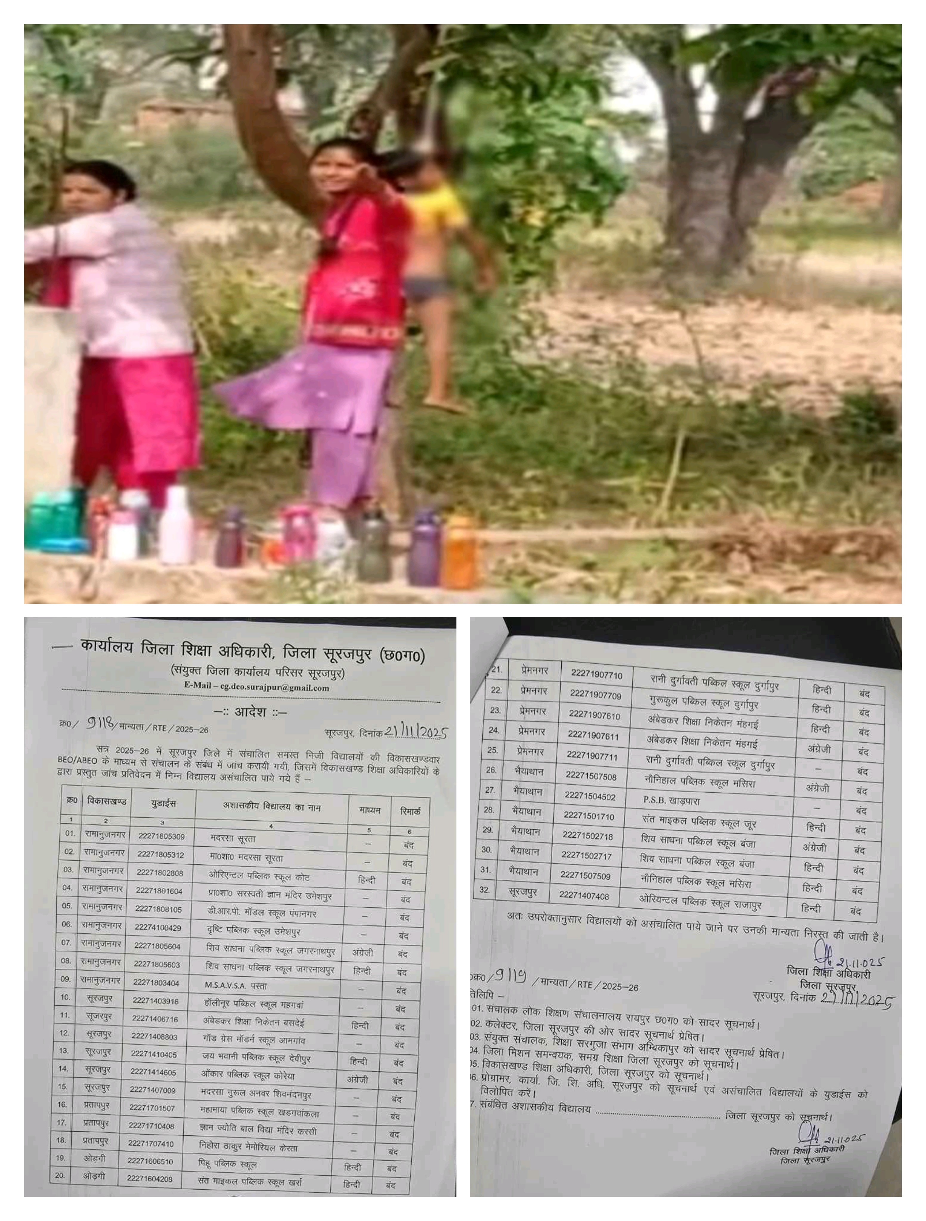 छत्तीसगढ़ के सूरजपुर जिले में एक मासूम बच्चे को होमवर्क नहीं करने पर रस्सी के सहारे पेड़ पर लटकाने की घटना के बाद जिला प्रशासन ने बड़ा एक्शन लिया है। जिला शिक्षा अधिकारी ने तय मानकों का पालन नहीं करने वाले 32 निजी स्कूलों की मान्यता रद्द कर दी है। जांच में पाया गया है कि ये सभी स्कूल मैदान में संचालित नहीं थे।