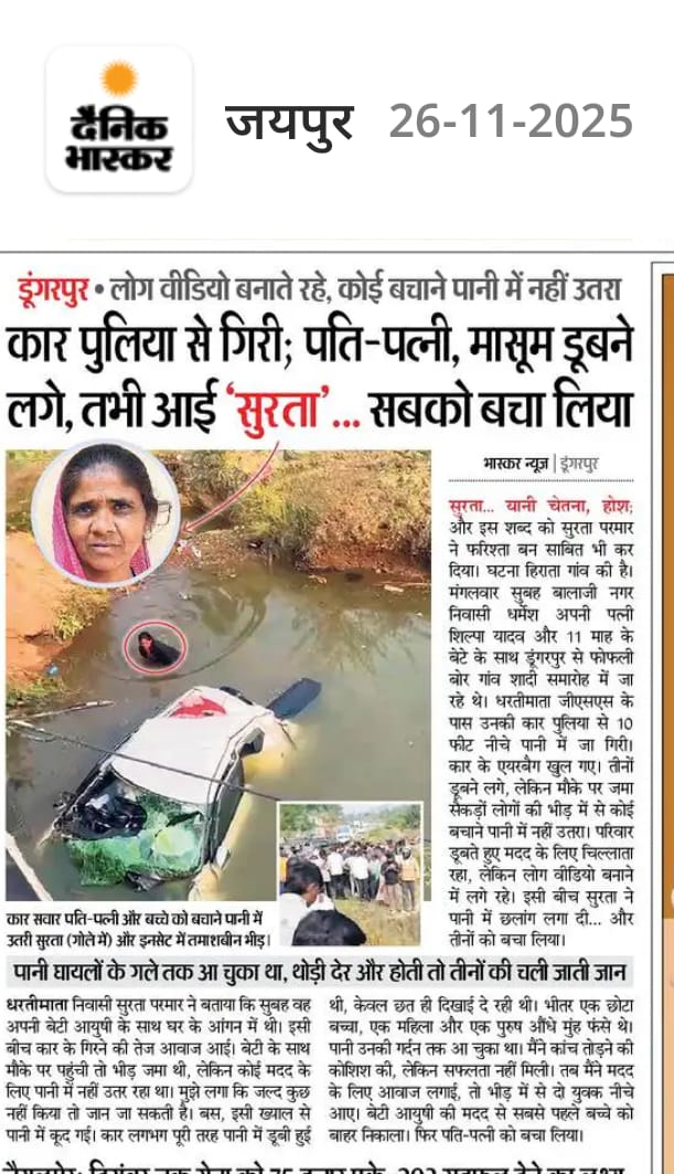 कार पुलिया से गिरी,पति-पत्नी, मासूम डूबने लगे तभी सुरता,, नें दिखाई बड़ी बहादुरी,सबको बचा लिया🙏🏻🙏🏻🙏🏻